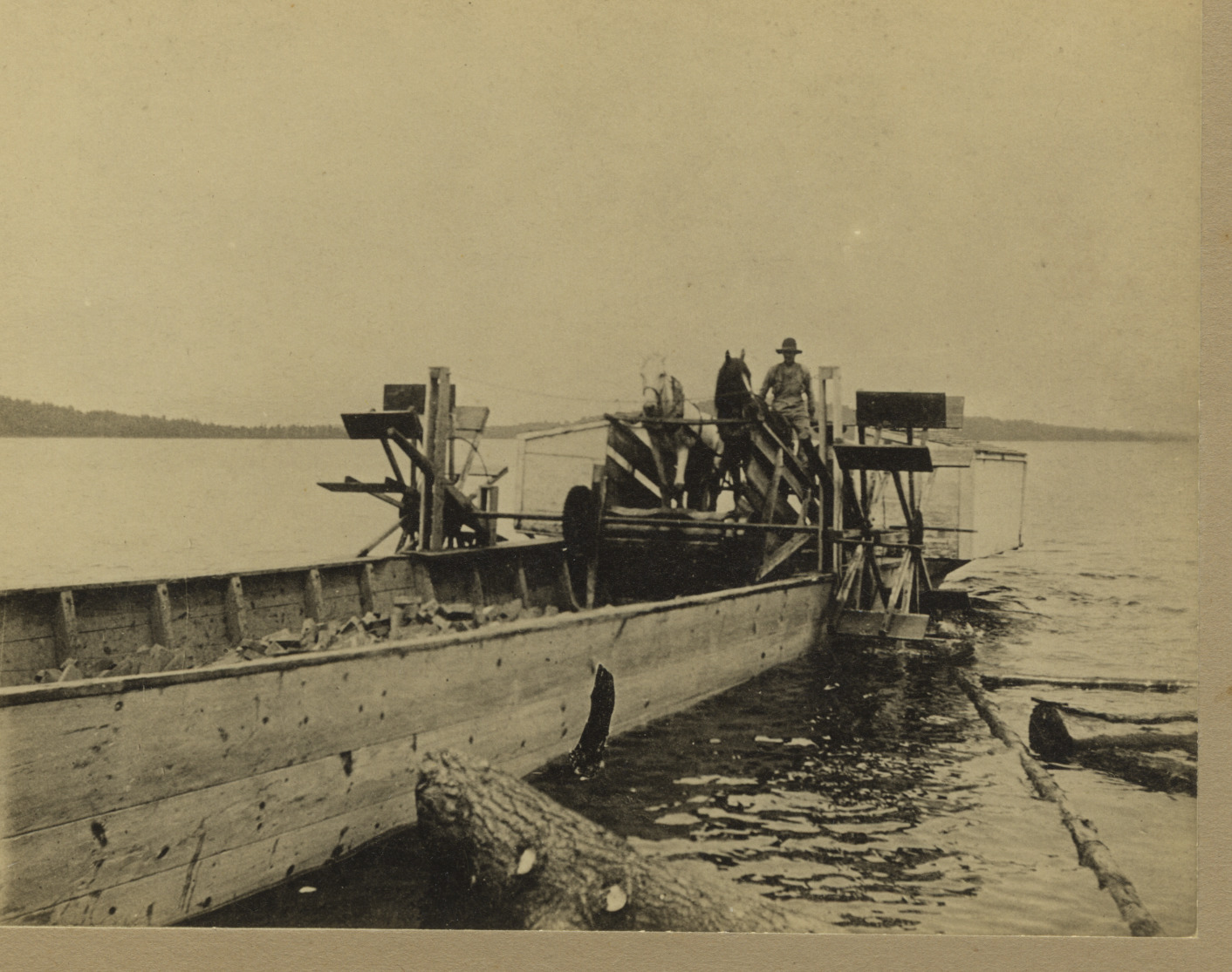 An unusual craft on the lake was the horseboat, powered by two horses on a treadmill driving paddlewheels. The first one was believed built in Meredith, c. 1838. Several continued to operate into the 1880's, well after steamships became dominant. This photo on Lake Winnipesaukee was taken c. 1870's, 1880's; the load is a heavy pile of bricks.