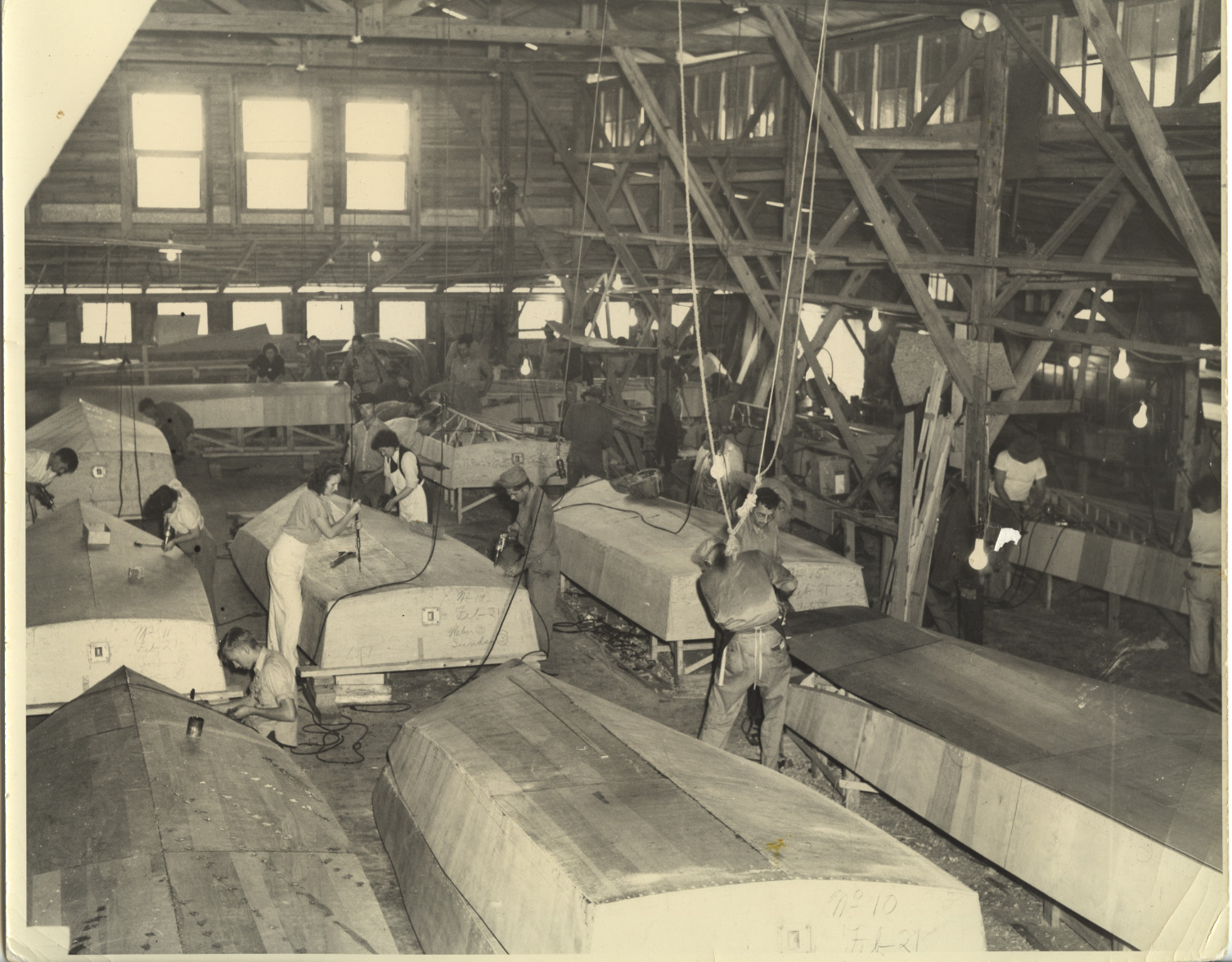 Goodhue & Hawkins Navy Yard on Sewall Road, boat building production line, c. 1940.