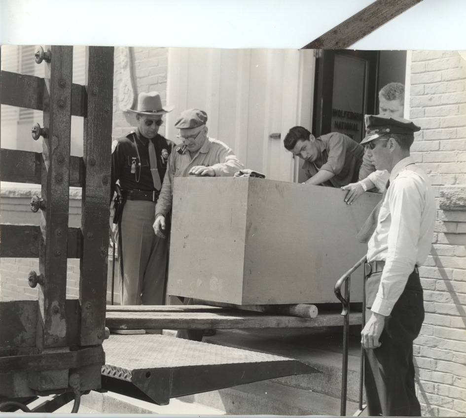 The S. W. Thistle Company of Cambridge, Mass., is moving a safe from the former site of the Wolfeboro National Bank to the new building on Center St., c. 1962. L-R, Sgt. Charles Aspinell of the State Police, Mr. Thistle, two unidentified helpers, and Officer Bruce Beaulieu of the Wolfeboro Police Force.