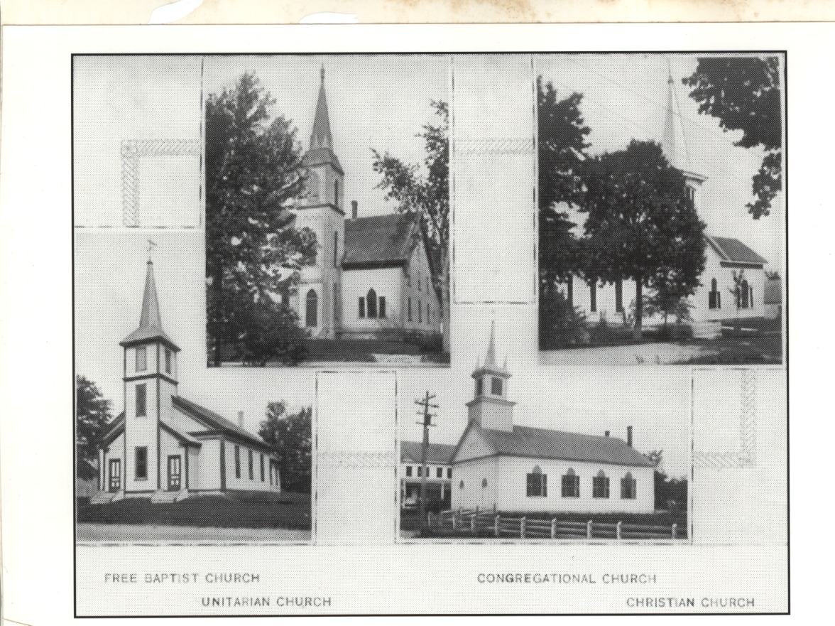 Some Wolfeboro Churchs, c. 1900. L-R, Free Baptist Church, Unitarian Church, Congregational Church, Christian Church.