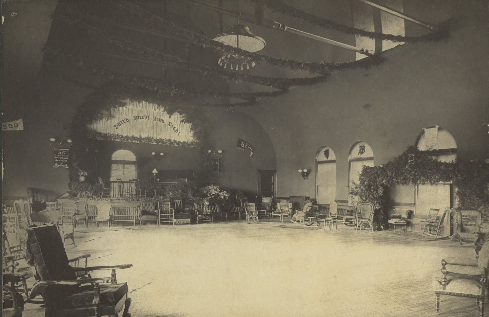 The main room in the Masonic Temple on Glendon St. The Masons obtained this building from the Unitarian Church in 1912. The photo is probably shortly after their remodeling. The building is now the Village Players theater.
