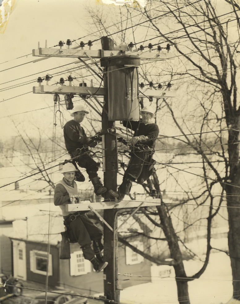 Linemen of the Municipal Electric Department in the early 1950's. Lower left, Gordon E. Glidden, upper L-R, Edward Fraser? and Edwin R. Craigue.