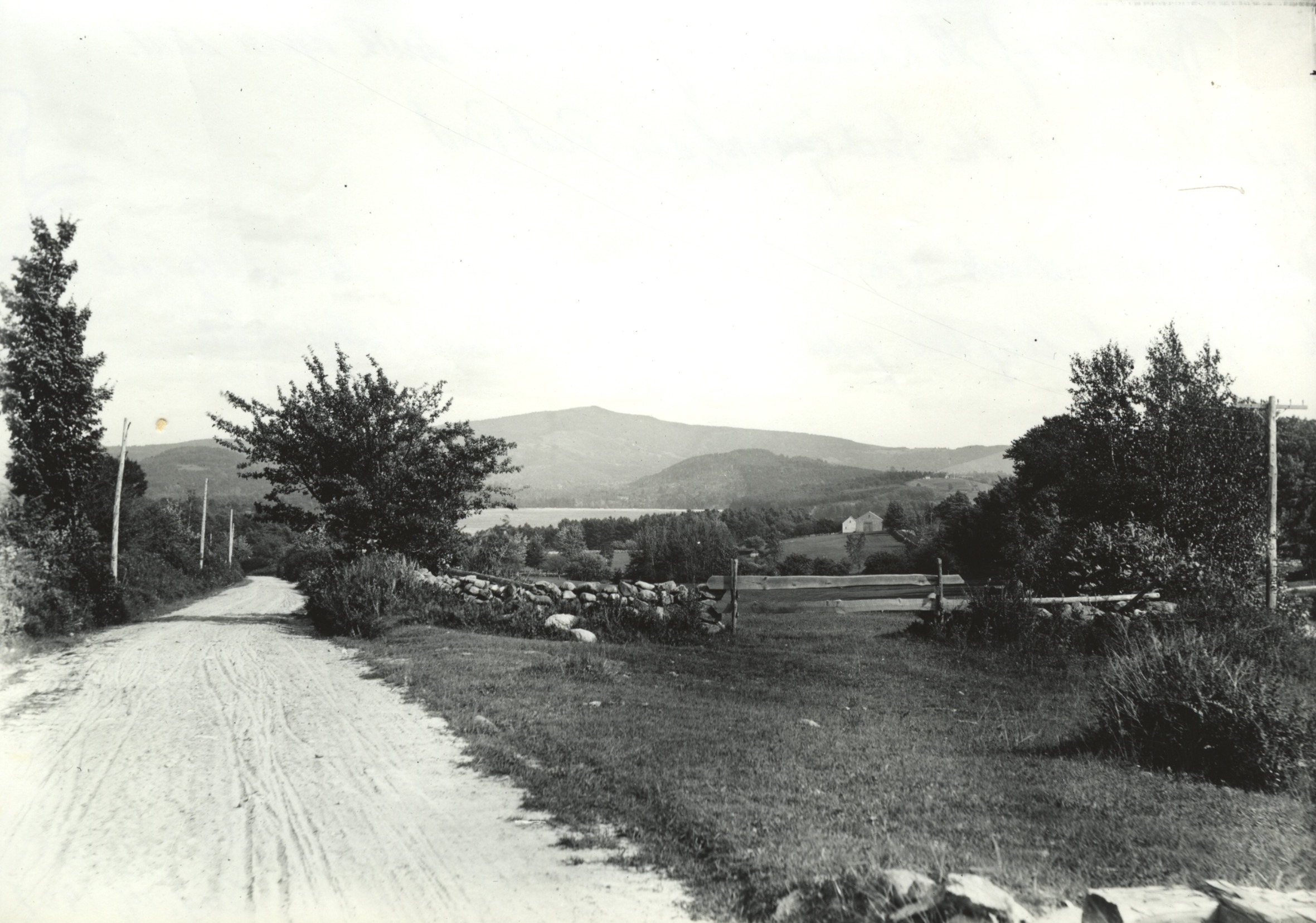 View of Rust Pond & Copple Crown Mt., taken from the Brewster Farm near the junction of South Main St. & Pleasant Valley Rd., Aug. 14, 1907. The road on the left is Pleasant Valley Rd. This area was covered by orchards in the early 1920's. Similar views from this area were made into postcards and widely distributed.