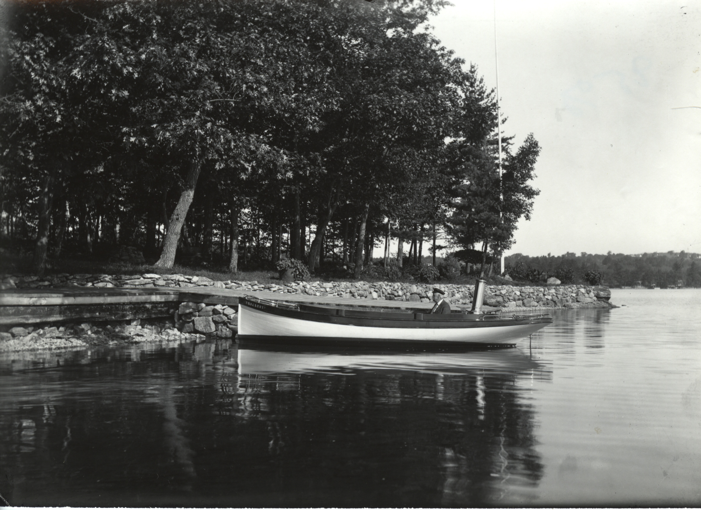 Colonel L. F. Hovey's camp "Woodhaven" on Sewall Point. This was the first camp at Sewall Point, built in 1895 by Harry Jones. Col. Hovey is at his wharf in "Margaret", a boat that used naptha for fuel.
