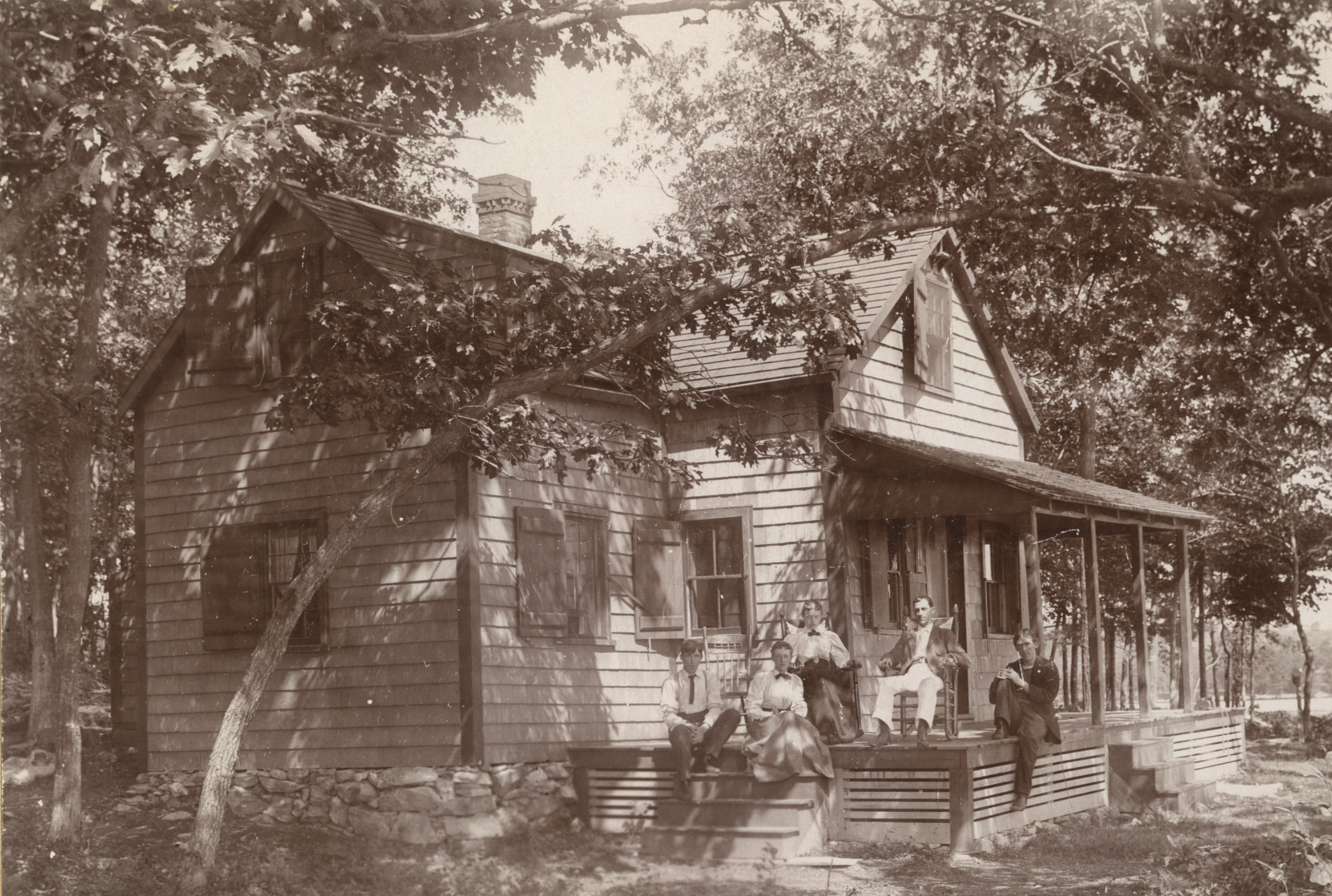 Harry Jones camp on Sewall Point. This was the first camp there, built in 1895. The camp was named "Monhegan Lodge" and "Camp Comfort" at various times. Photo taken August, 1895.