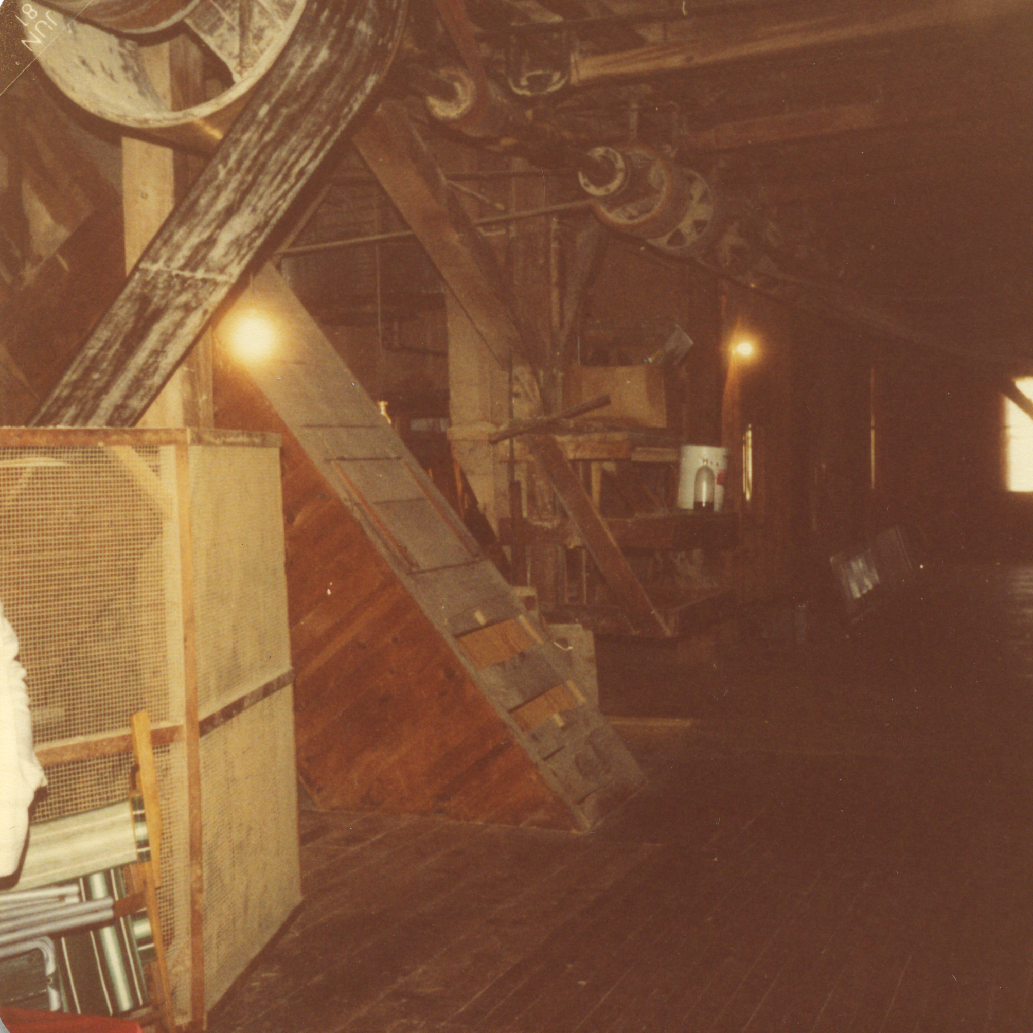 Interior of the Berry Excelsior Mill, June 1981. The mill was last used in 1976. The shaft running diagonally across was driven by water power and operated several machines via belt drives; some are still intact.