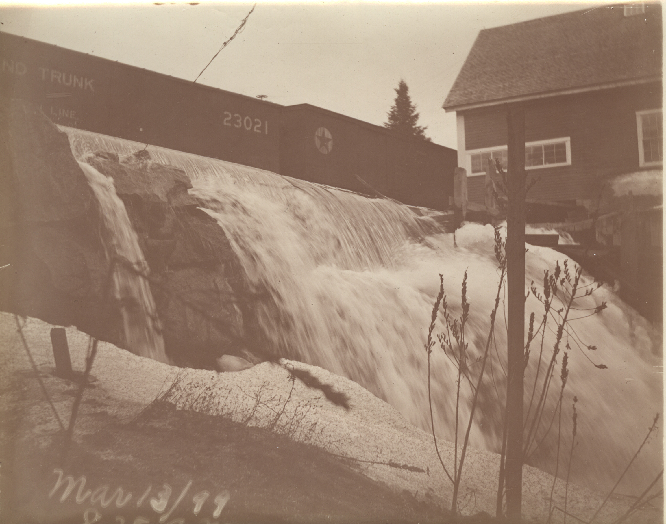 Water spills from the Mill Pond dam on Center St., March 1899. Railroad boxcars are on the tracks above the dam. The water spills into Back Bay.