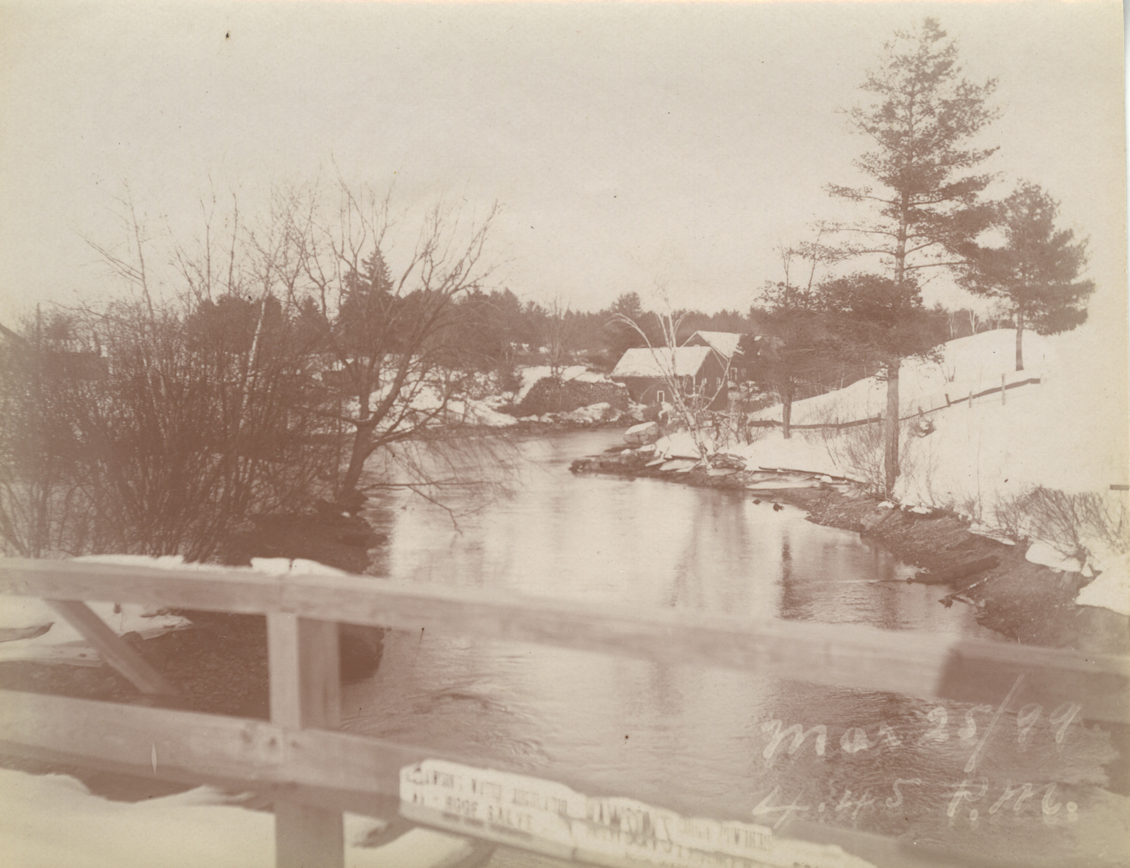 View from Center St. looking upstream at the Smith River, coming from the dam at Crescent Lake. Taken March, 1899, this is period of high water.