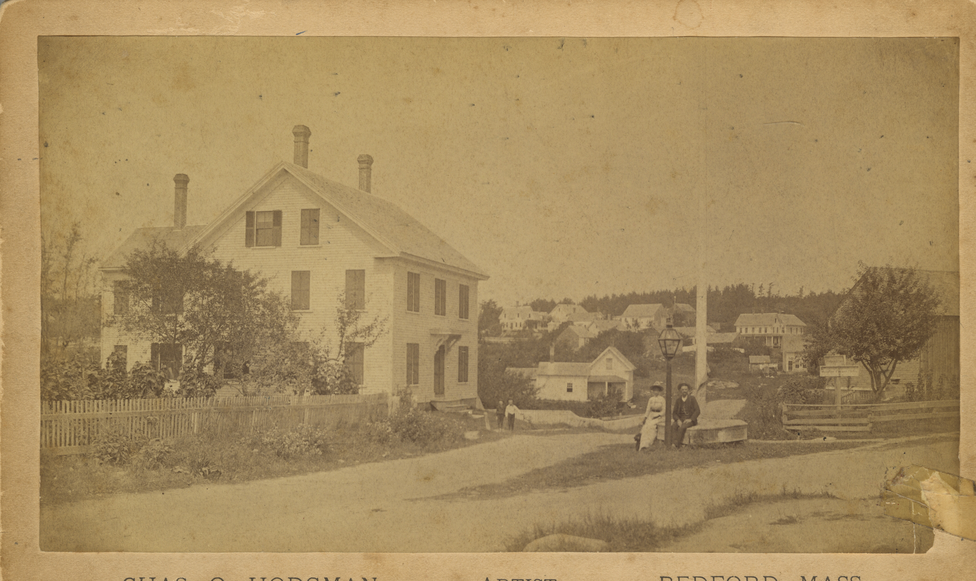 Junction of Elm St. and Center St. (on the right) in Wolfeboro Falls, c. 1885. View is looking up Elm St. Divider has a gas lamp, bench seat and probably a horse watering trough. House on the left is called the Osborne H. Abbott house.