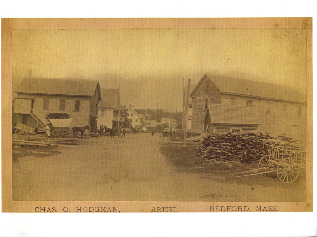 Center St. in Wolfeboro Falls, c. 1890's, looking from the Smith River bridge north toward Elm St. The first building on the left is the Joseph P. Heath Store, selling dry goods and groceries. The second building on the left is Hersey's Market (Charles D. Hersey), which was a meat market. The large building on the right is believed to have been a blacksmith shop (one of several in the area).