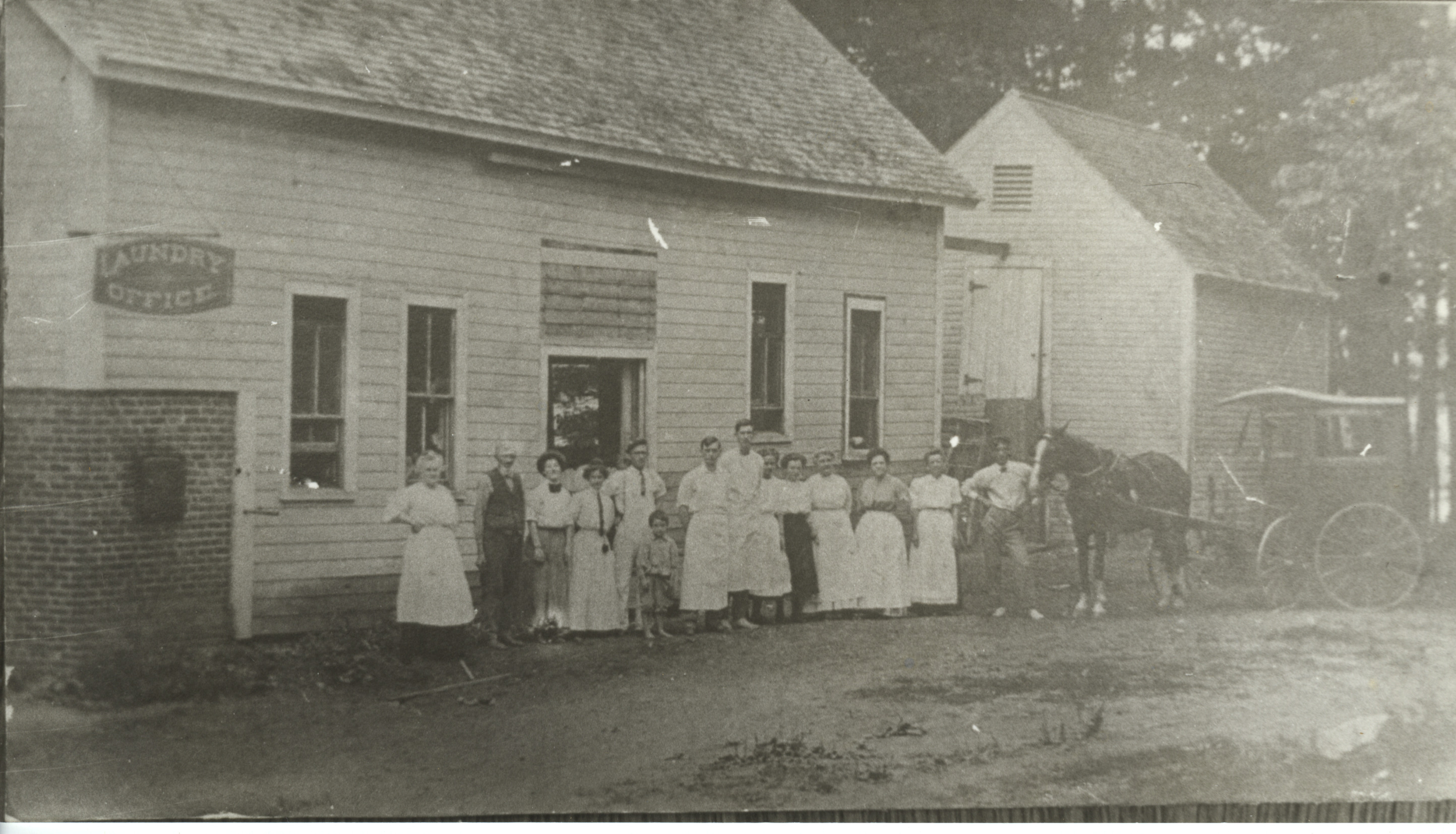 Wolfeboro Laundry on Center St. at Grove St., Wolfeboro Falls, early 1900's. This appears to be the original building, erected in 1894 as a dairy cooperative called the Wolfeboro Creamery. After the Creamery ceased operation in 1905, Harry E. Libby leased the building and started the Wolfeboro Laundry in 1906 (he bought the building in 1909). Operating as a commercial laundry, the one-horse wagon at the right was used for pickups and deliveries. The building burned down in 1917, was quickly rebuilt, then demolished in a boiler explosion in 1924, and again rebuilt.