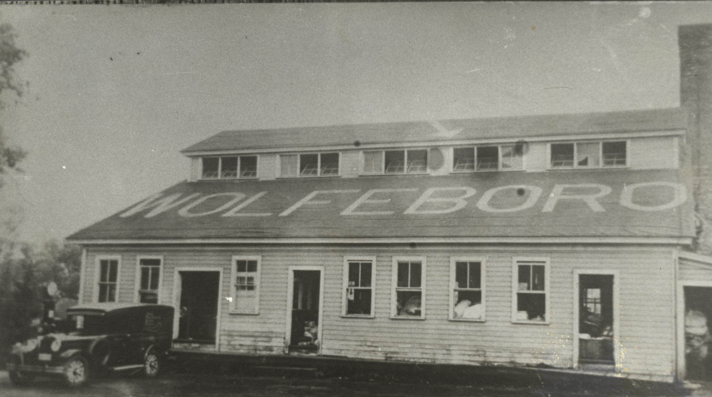 The Wolfeboro Laundry building on Center St. at Grove St., Wolfeboro Falls, owned by Harry E. Libby, displays the town name on the roof, c. 1930's. The sign was intended as a guide for aviators, blacked out in 1942 to avoid helping enemy planes, then repainted after the war. This building was erected in 1925, after the previous building was demolished by a boiler explosion in 1924. The business operated until 1967.