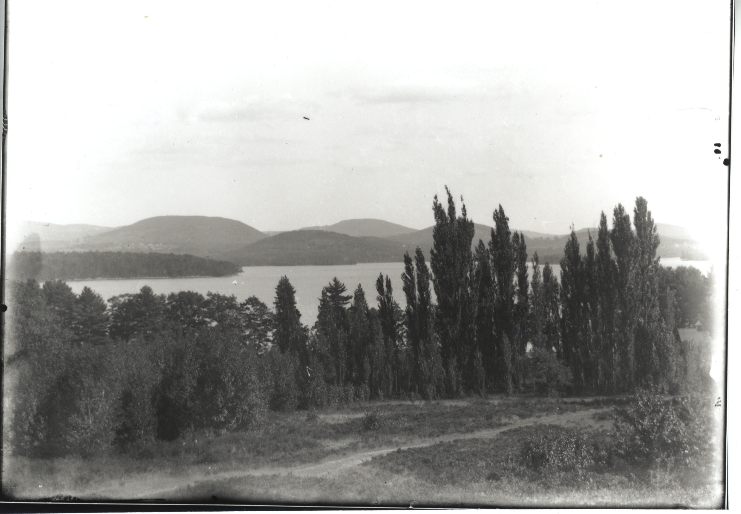 View across Wolfeboro Bay looking southwest. Clark's Point in the Bay, Mt. Longstack in the background, both left of center, c. 1900.
