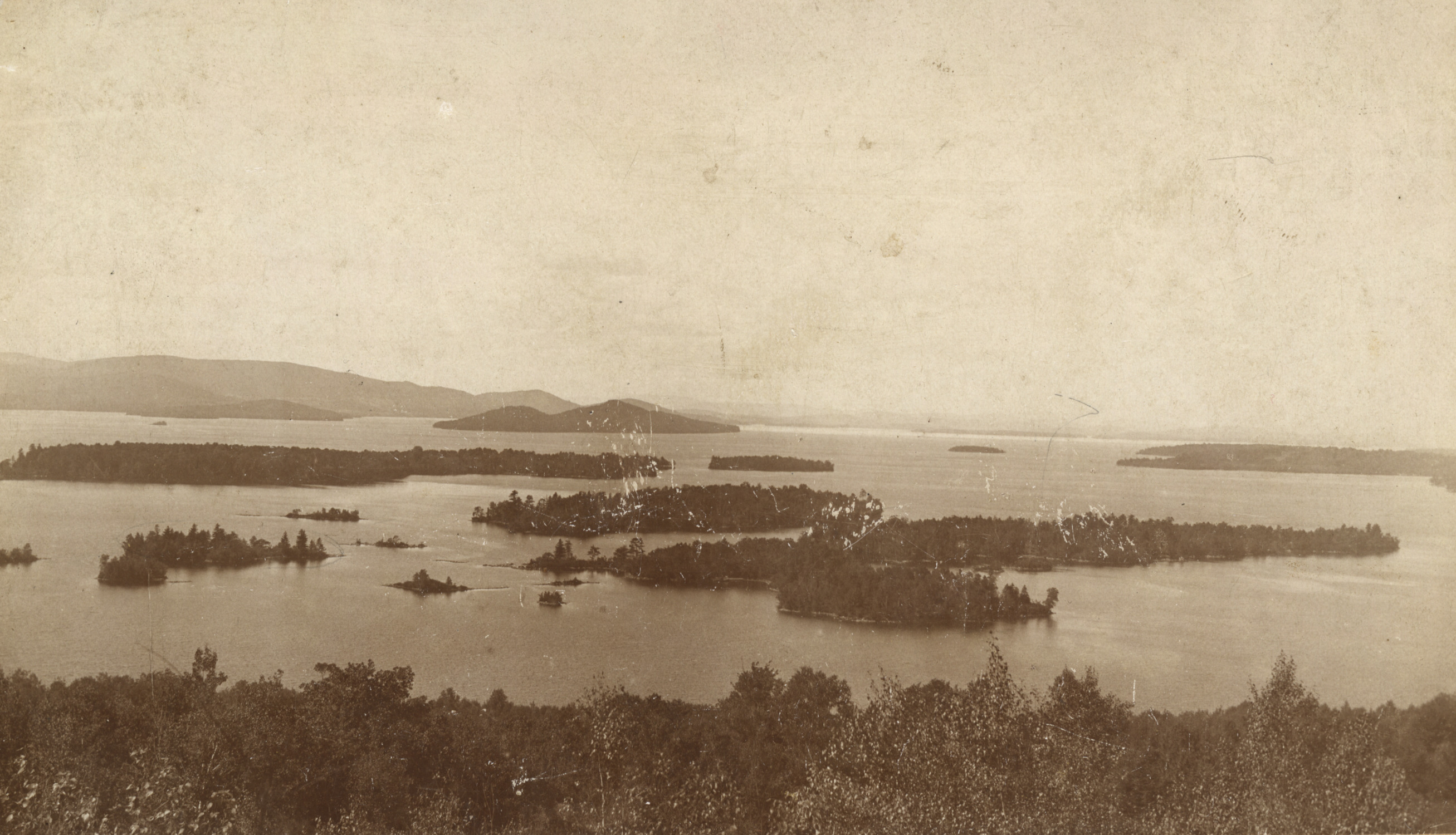 Lake Winnipesaukee view, taken from Dug Hill, in South Wolfeboro near the Alton Town Line, c. 1885. The distant island with two peaks is Rattlesnake Island. Toward the foreground is Big Barndoor Island extending to the left, Little Barndoor Island next to it, then Keniston Island and Melody Island. The Varney Islands are scattered on the left. This photo was used as a Christmas greetings card from Everett S. Albee, a jeweler and photographer, c. early 1900's.