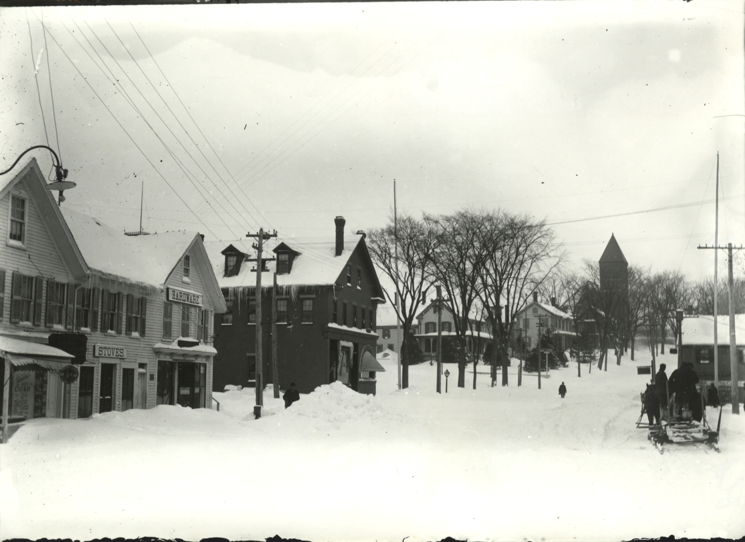 View from the bridge area toward South Main St., Feb. 1, 1898. On the left, Blake Folsom's Hardware Store is now Black's Paper Store. The Bank Building is next and blocks the view of the hotel which was on the Post Office site. The two buildings before Brewster Memorial Hall were later removed and became the site of the supermarket parking lot and a gas station (since replaced by Citizen's Bank).