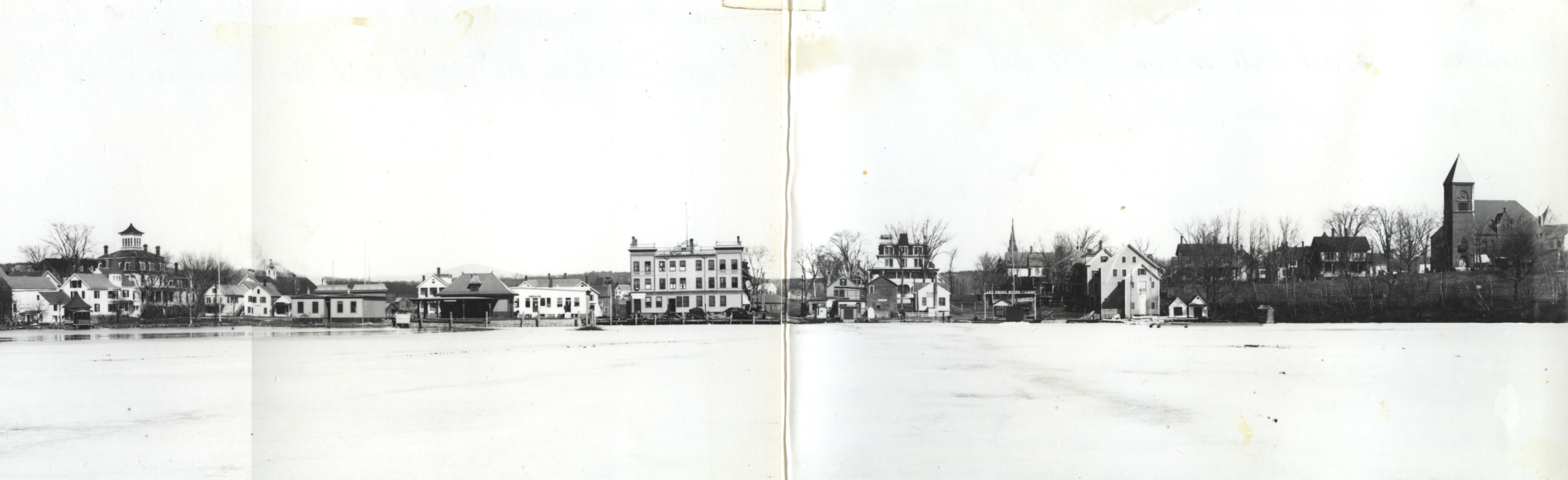 A panoramic view of downtown Wolfeboro, taken from the ice, c. 1910. L-R, the cupola marks the Durgin Block, below & slightly left is the Piper House (turret can be seen if you blow up the view), later moved toward the lake (1956); the Yum Yum Bakery is there now. A few buildings over is the outlet of Back Bay with the darker Railroad Depot in the foreground; the Wool Corner is behind on the left, Goodwin Block to the right, then the larger Peavey Block, now the Avery Block. To the right, the mansard roof marks the Hotel Elmwood, where the Post Office is now, the spire in the background is the Unitarian Church Spire on Glendon St., now the Village Players Theater. The group of connected buildings leading to the lake was the Lake Shore House, now the site of Cate & Town Park. Next in the background are two prominent houses, the Folsom House, now the supermarket site, and the Peavey House, now Citizen's Bank, followed by Brewster Memorial Hall (Town Hall).
