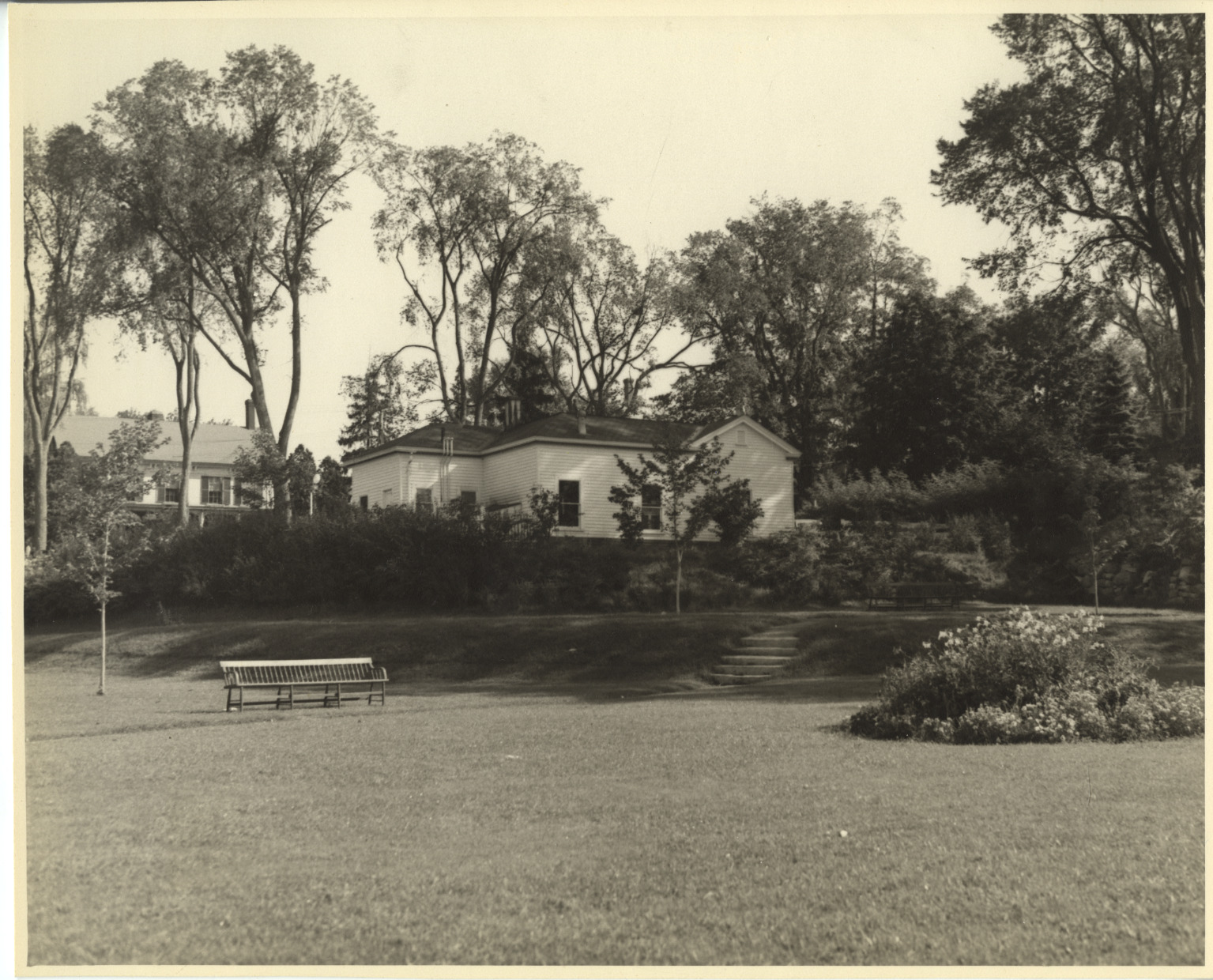 This photo is taken from Cate Park looking toward South Main St. It reflects the appearance from the early 1940's until 1967. The site from the street to the lake shore was previously a hotel built in 1847, called Horn's on the Lake, Belvue House, Lake Shore House, and Ann Inn. The hotel was razed in 1940. The streetside building in the center is the Fred E. Varney Esso Gas Station. The foreground became known as Cate Park. In 1967, the gas station was torn down, and its site became Town Park.