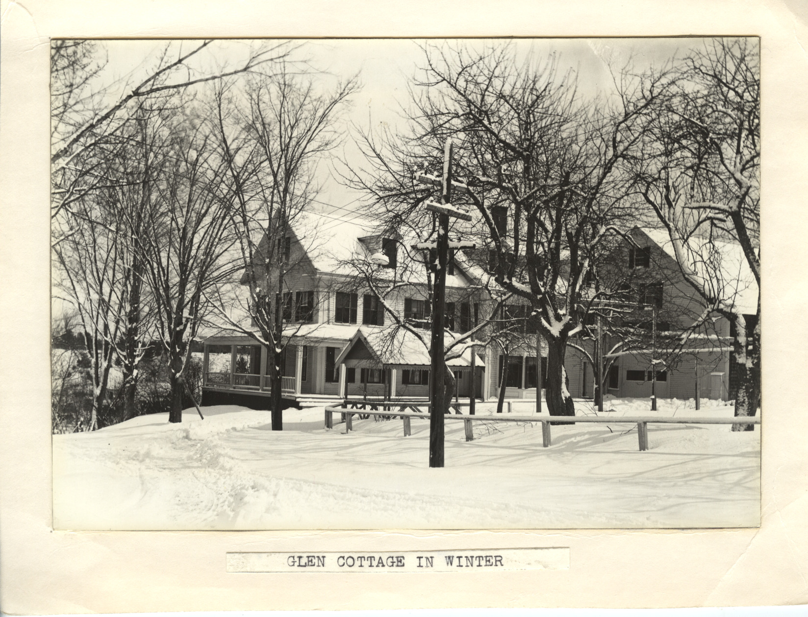 Although the caption says Glen Cottage, this photo is believed to date to c. 1927. when Lester Wiggin purchased it, did some remodeling, and renamed it the Wolfeboro Tavern. The original sign on the front porch is gone, the first floor of the Annex has been made into rooms, and some shutters have been added. Compare this with the previous photo. The name was used until 1947, when it was changed to the Tavern Inn.