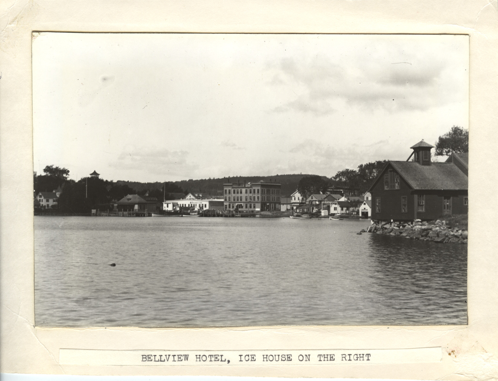 The caption on this photo is quite misleading, with poor misspelled wording. The Ice House on the right belongs to the Belvue House. The Belvue House, originally built in 1847, is the group of several buildings and a boathouse, seen to the right of the large building in the center; by this time the name has changed to the Lake Shore Hotel (the site is now Cate and Town Parks). The large building is the Peavey Block, still standing and now known as the Avery Block. To its left, the one-story building confirms the photo date as early 1900's, since the former large Goodwin Block is gone, burned in an 1899 fire.