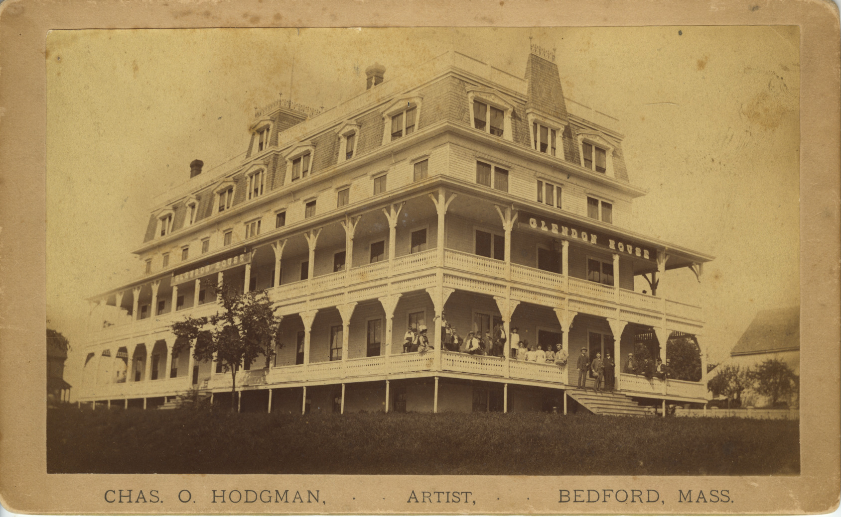 Built as the Glendon House in 1872, this impressive 4-story hotel with a mansard roof was in the center of downtown. Later, it was the Wolfeboro Hotel, New Wolfeboro Hotel, Hobbs-Is-Inn and Hotel Elmwood. It was razed in 1935 to build the present Wolfeboro Post Office. Photo was taken c. 1890's, when it was the Glendon House.