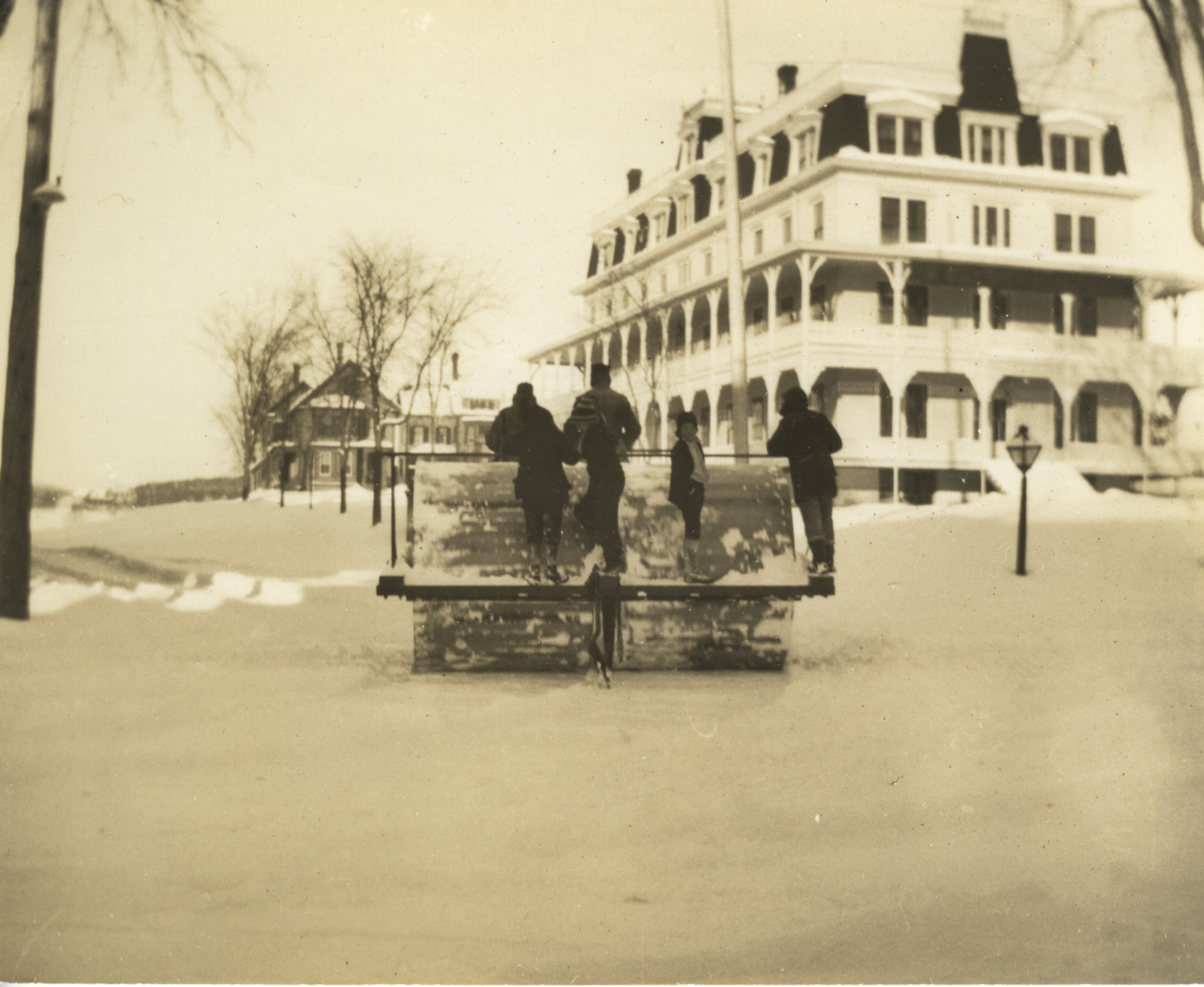 Built as the Glendon House in 1872, this impressive 4-story hotel with a mansard roof was in the center of downtown. Later, it was the Wolfeboro Hotel, New Wolfeboro Hotel, Hobbs-Is-Inn and Hotel Elmwood. It was razed in 1935 to build the present Wolfeboro Post Office. Photo taken c. 1890's, when it was the Glendon House. A snow roller is being used to pack down the streets.