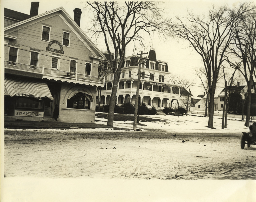 Built as the Glendon House in 1872, this impressive 4-story hotel with a mansard roof was in the center of downtown. Later, it was the Wolfeboro Hotel, New Wolfeboro Hotel, Hobbs-Is-Inn and Hotel Elmwood. It was razed in 1935 to build the present Wolfeboro Post Office. Photo was taken Feb. 7, 1916, when it was the Hotel Elmwood. The building on the left is best known as the Bank Building, now a realty. Henry Cotton, a successful businessman dealing in lodging and cattle, had bought the building in 1905, and later was a director of the Wolfeboro National Bank.