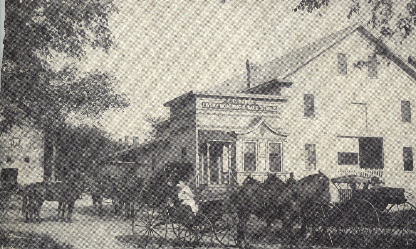 This is the Hobbs-Is-Inn Livery Boarding & Sale Stable, 1899-1909. In 1902, Hobbs advertised a livery of 25 horses. This view is on Glendon St., and the road left of the livery is School St. The main structure later served many businesses including the Kammler Automobile Agency and Wolfeboro True Value Hardware. Torn down in 1994, the Rite Aid Pharmacy, now the Walgreens Drugstore, was built on the site.
