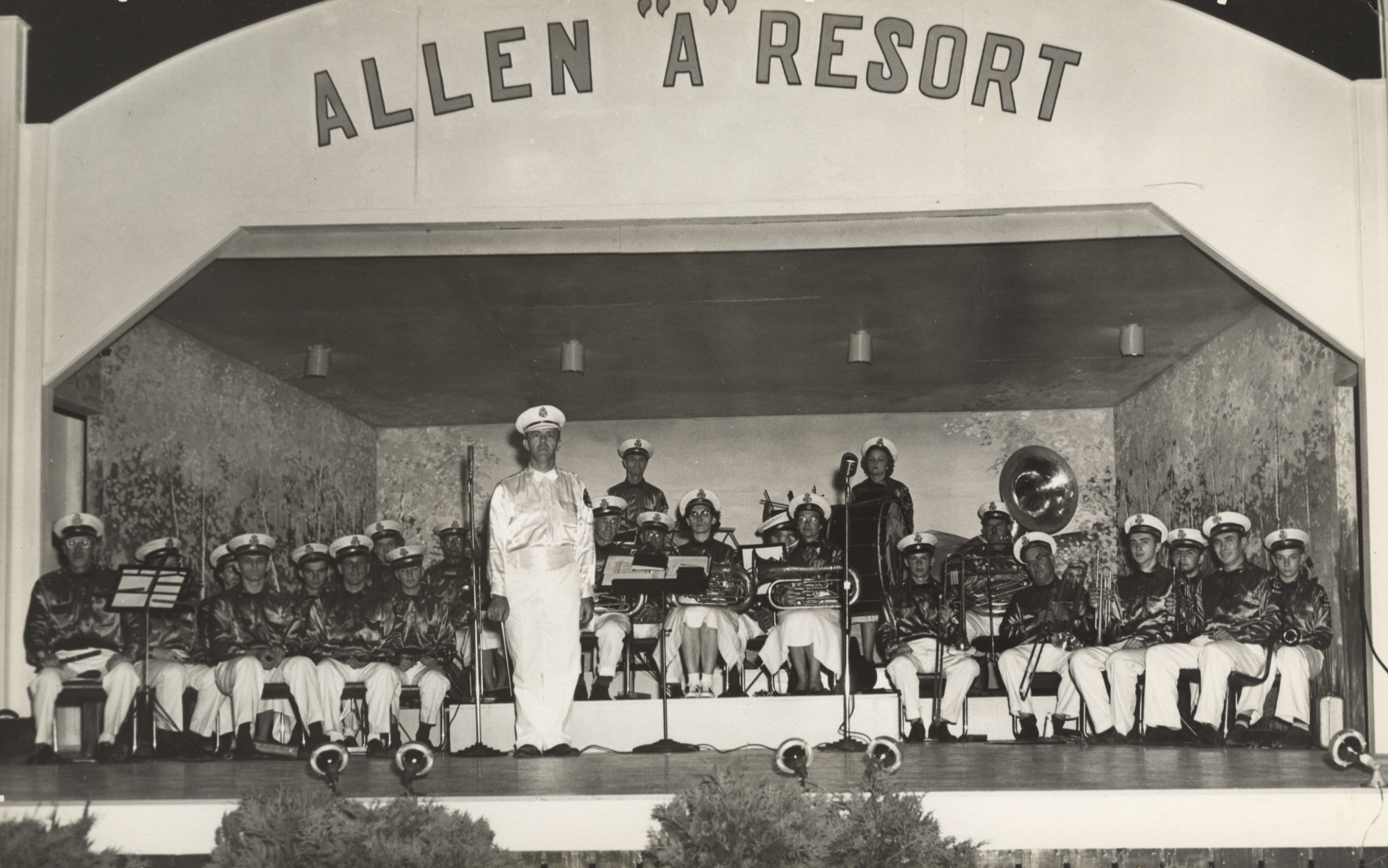 The Allen "A" Resort on Rte. 28 was begun in 1935 by Allen H. and Lillian L. Albee. The enormous resort provided lodging, meals and entertainment and expanded to as many as 80 cabins, 5 lodges, the 1810 House, a theater (quonset hut, now the Boat Museum), dude ranch, beach on Lake Wentworth (now Albee Beach), several dining halls and a motel. After many successful years with hundreds of guests each week during the summer, a period of decline began as Allen H. Albee, in poor health, sold the resort. In the early 1980's, only the motel was active. This 1954 photo is the Allen "A" Resort band entertaining in the Quonset Hut Theater. See also, photos 36, 37, 55-71 in this group.