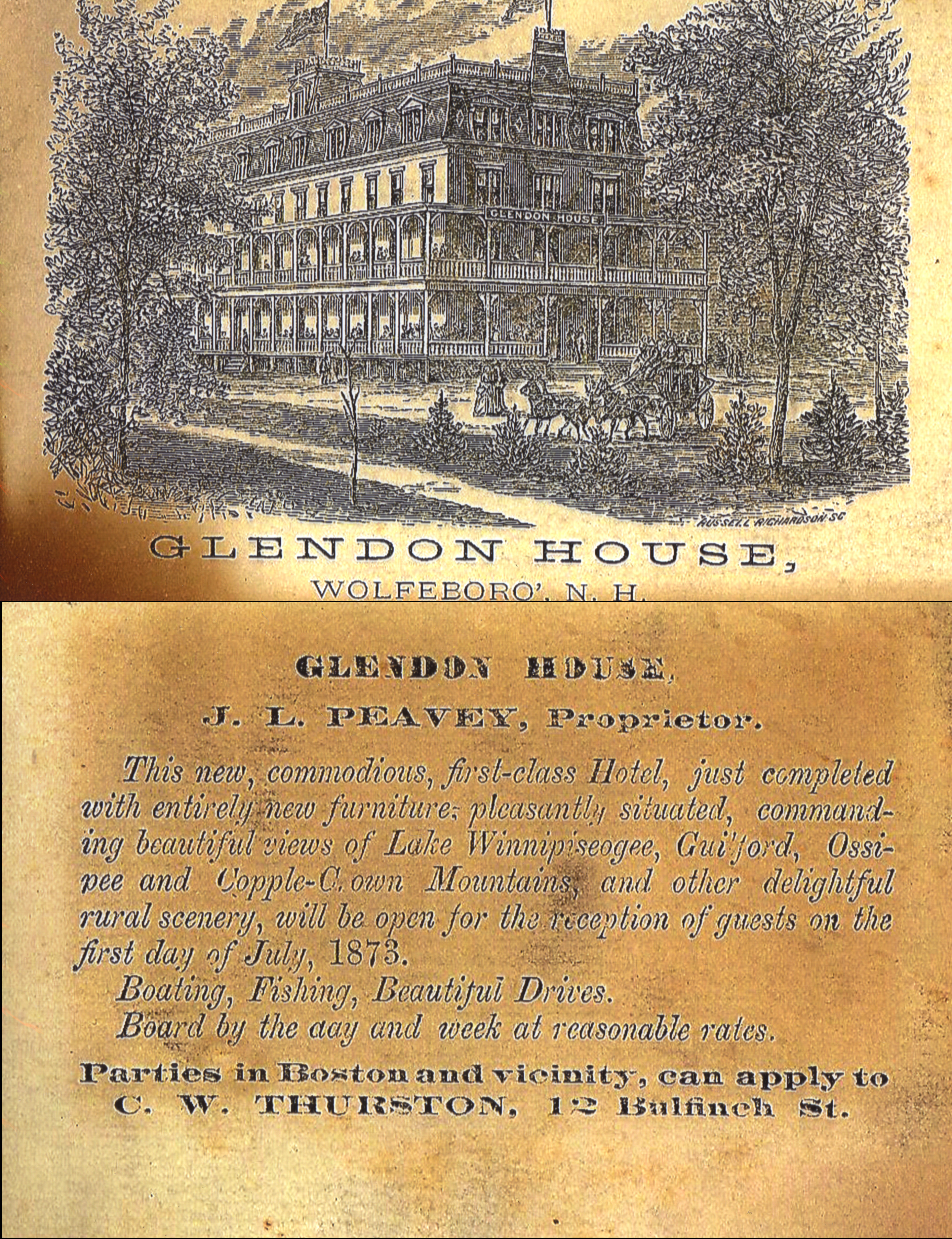The Glendon House was built in 1872. This is the front and back of an advertising handout for the opening day on July 1, 1873. The hotel had several name changes, and was razed in 1935 to build the Wolfeboro Post Office.