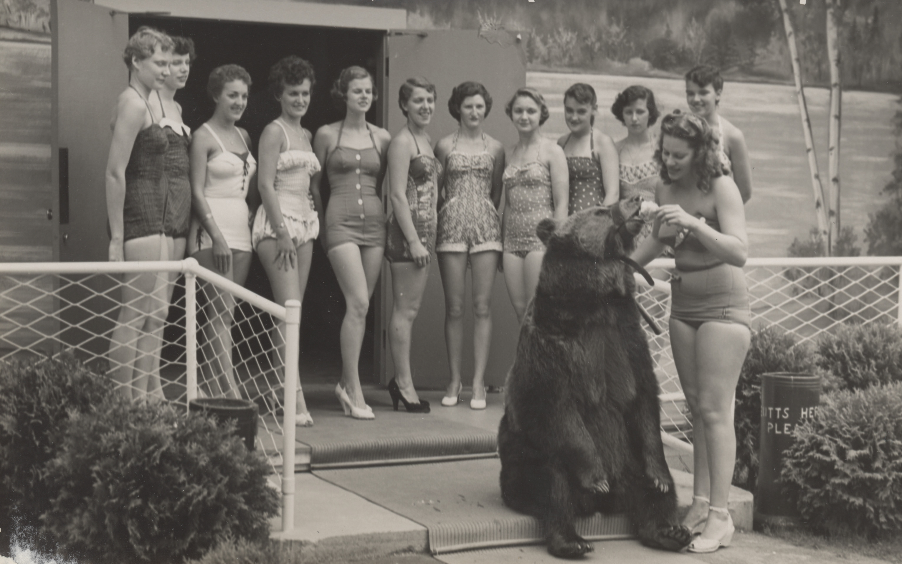 The Allen "A" Resort on Route 28. For history, see photos 35-37. Some of the amenities of the Resort are also on photos 55-71. Entrants in a weekly beauty contest watch the bear act. Bears actually love ice cream. 1950's.