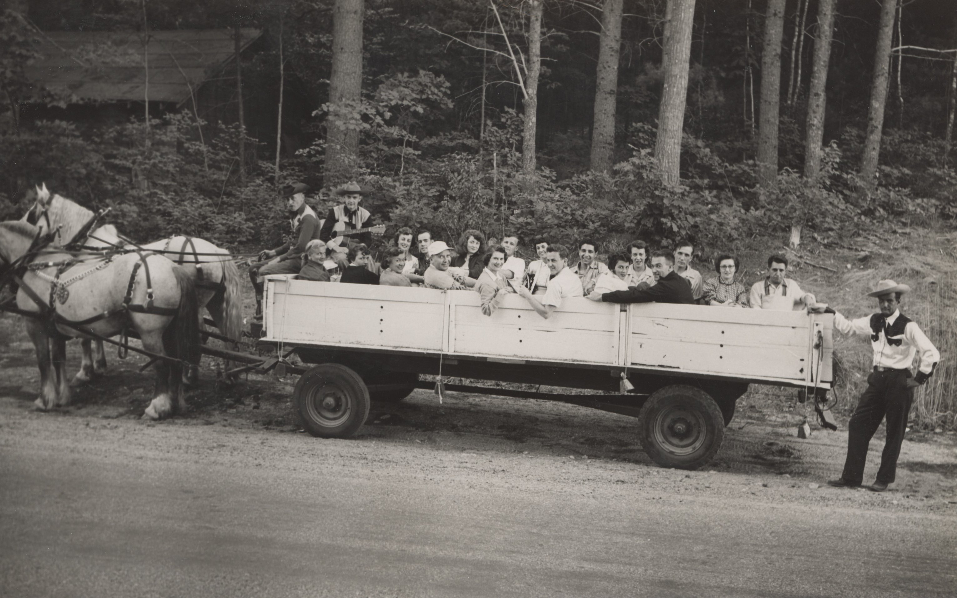 The Allen "A" Resort on Route 28. For history, see photos 35-37. Some of the amenities of the Resort are also on photos 55-71. Strong draft horses (just look at the size of their hooves) ready for a full wagon ride. 1950's.