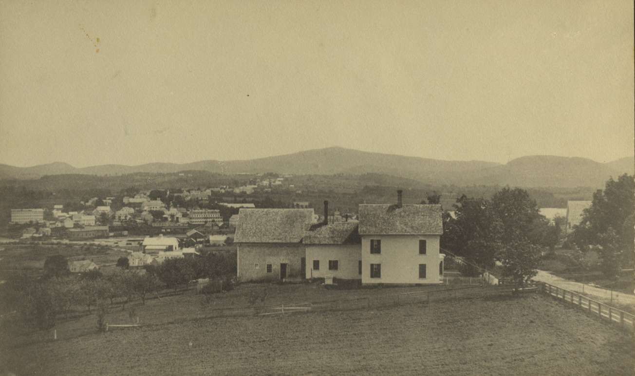 View from North Main St., taken from the Sam Hersey field, c. 1885. House in front was known as the Harold H. Hart house. Copple Crown Mt. is in the background. Clow's Sawmill shows just left of center; the Shoe Factory is across the bay.