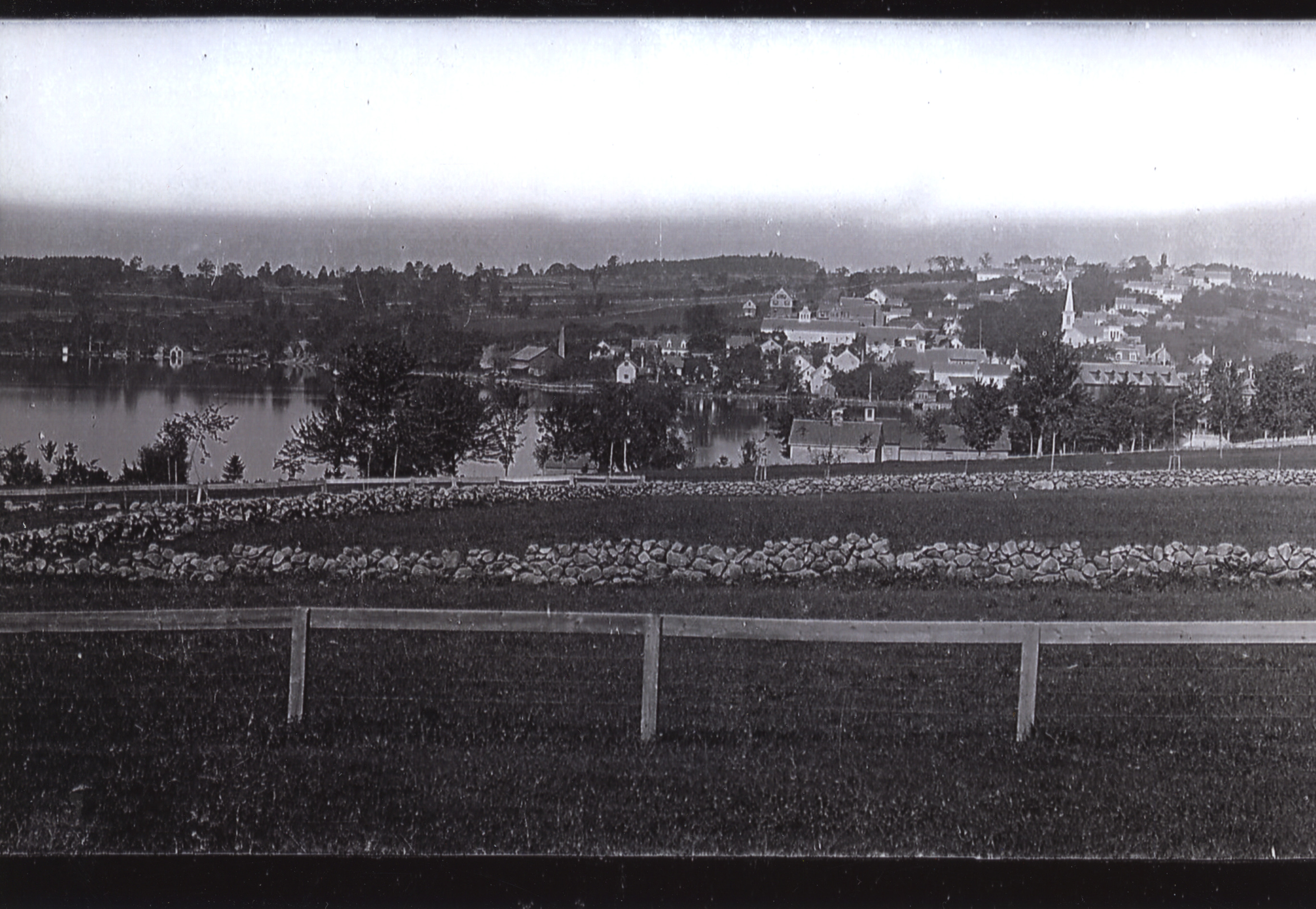 View from the residence of George A. Carpenter (Cobham Hall) looking northwest across Wolfeboro Bay. Downtown Wolfeboro is on the right. Sewall Rd. shore goes out on the left. The foreground is now part of Brewster Academy. C. 1898.