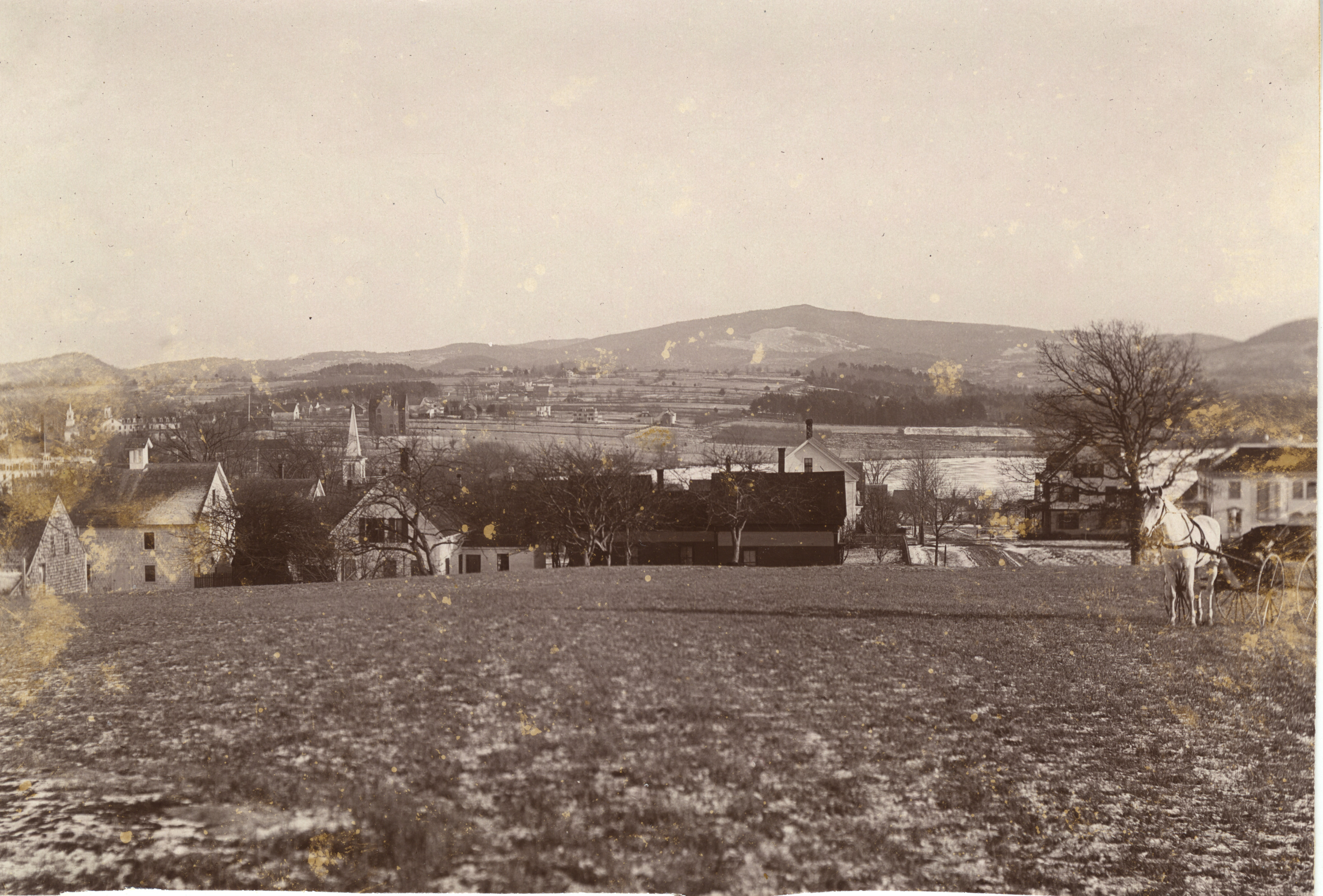 View from the area of Pleasant St., at the high end. First Christian Church steeple is left of center; just to the right of it, in the background, is the original Brewster Free Academy building, which was built in 1890 and burned down in 1903. To the left of the Church Steeple is downtown, with the Glendon House (mansard roof, now the site of the Post Office). Copple Crown Mt. is in the background. C. 1900.