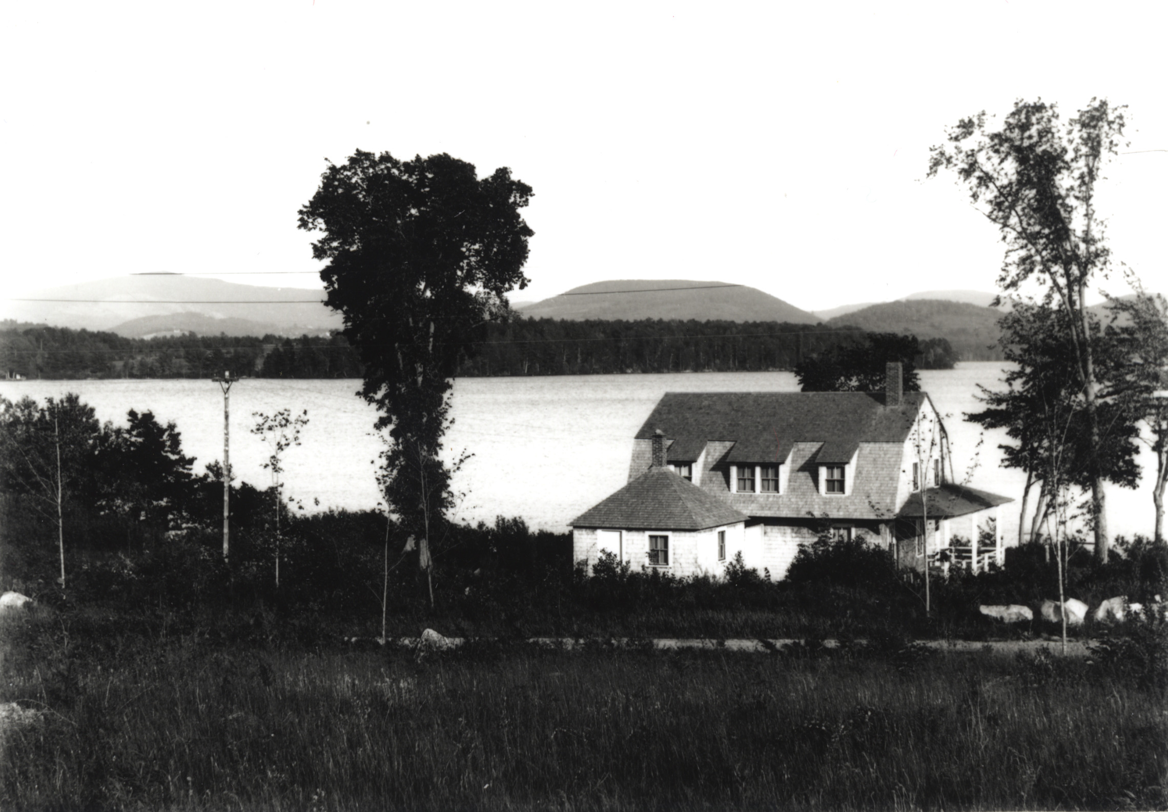 This is a view across Sewall Rd. and Wolfeboro Bay, C. 1900. Longstack Mt. is in the right center background. Copple Crown Mt. is on the left. The house is not identified.
