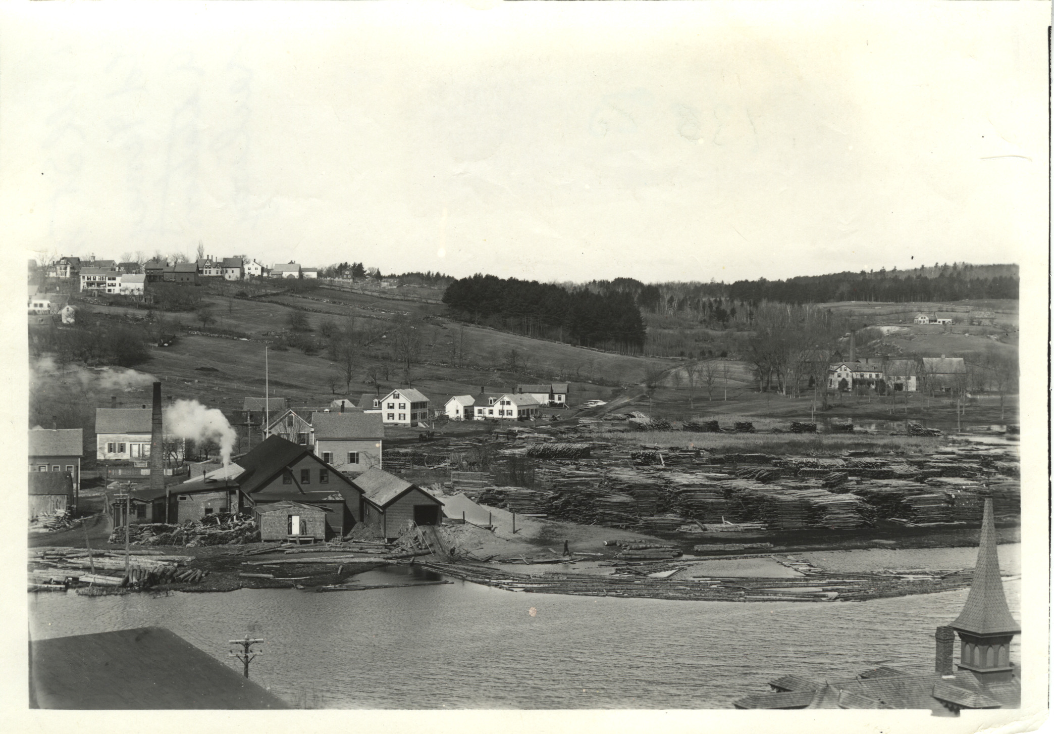 View from Hobbs-Is-Inn, c. 1900, looking across Back Bay to Clow's Sawmill. Wolfeboro RR Station spire is on the right. Sawn lumber stacks are drying on the right, and logs in the Bay are waiting to be processed. The Sawmill buildings were later replaced by Hampshire Pewter, and the lumber area became the Back Bay business complex.