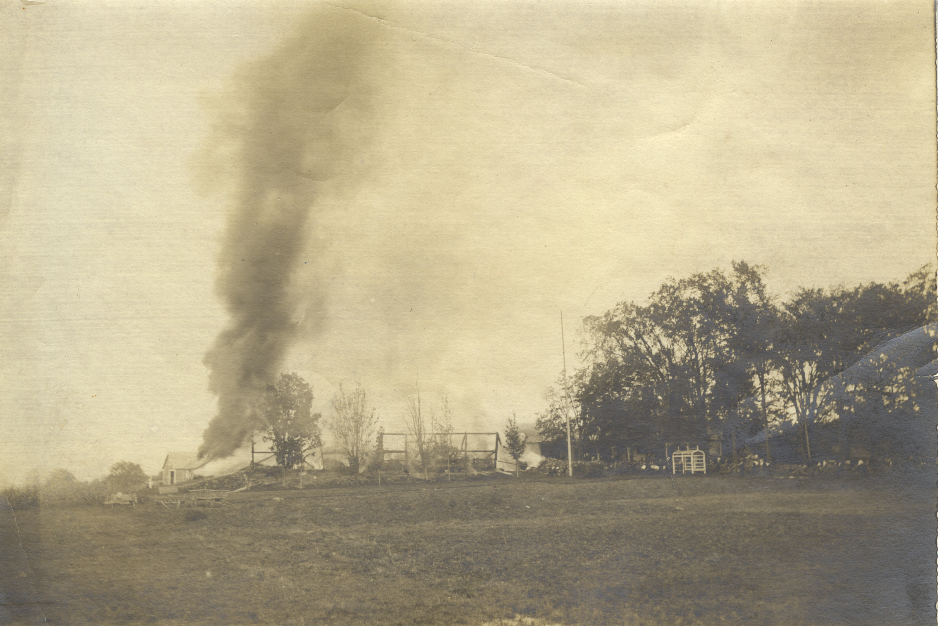 The Meader homestead on North Main St. near Forest Rd. was settlers farm No. 4. purchased by Ebenezer Meader about 1770. This photo was taken on Sept. 30, 1902, showing the burning of the first barn. The location is now Sky Ridge Farms.