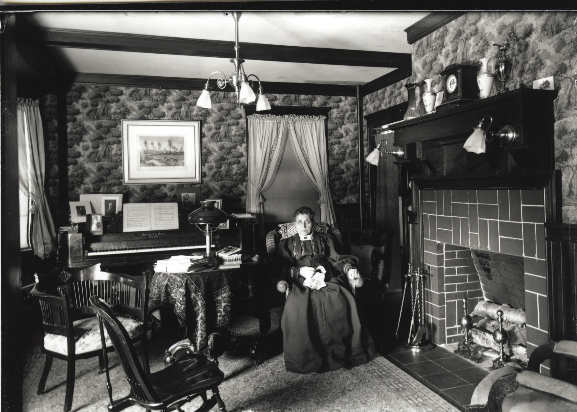 This is Mrs. Mabel Davis (of the Meader family) in her living room on Pleasant St., early 1900's. The room is wired for electricity including a ceiling fixture & two sconces on the fireplace mantel. The fireplace seems decorative rather than functional, as the interior bricks & birch logs are pristine. A note indicates the house is the next one up the hill from Sherman Parsons house.