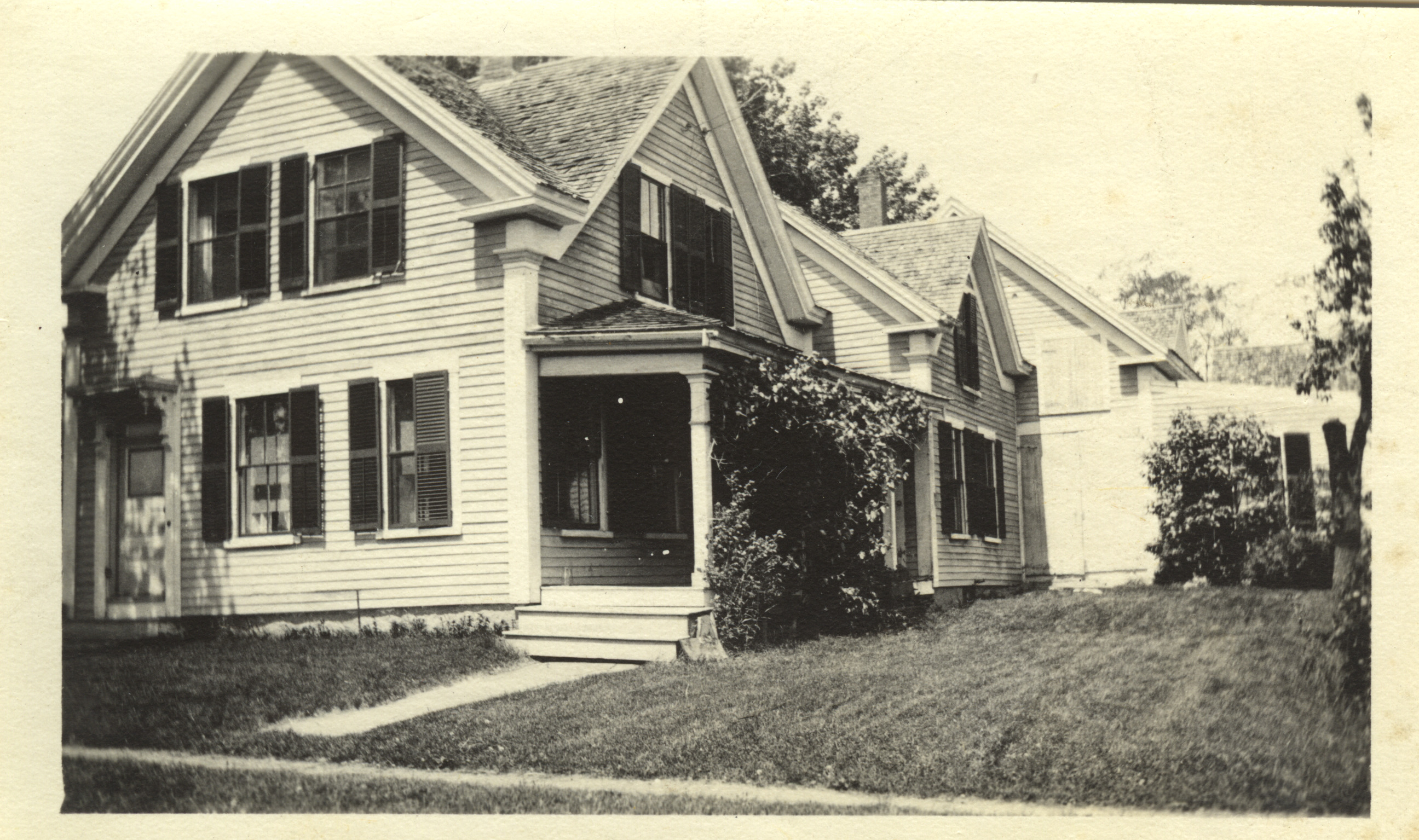This is the house of Jessie Fields on the corner of Pleasant St. & Oak St., undated, but probably early 1930's. She was a 2nd grade teacher at Carpenter School. The house has been remodeled from the previous photo. The enclosed porch has been opened, shutters have been added & the corner tree has grown up.