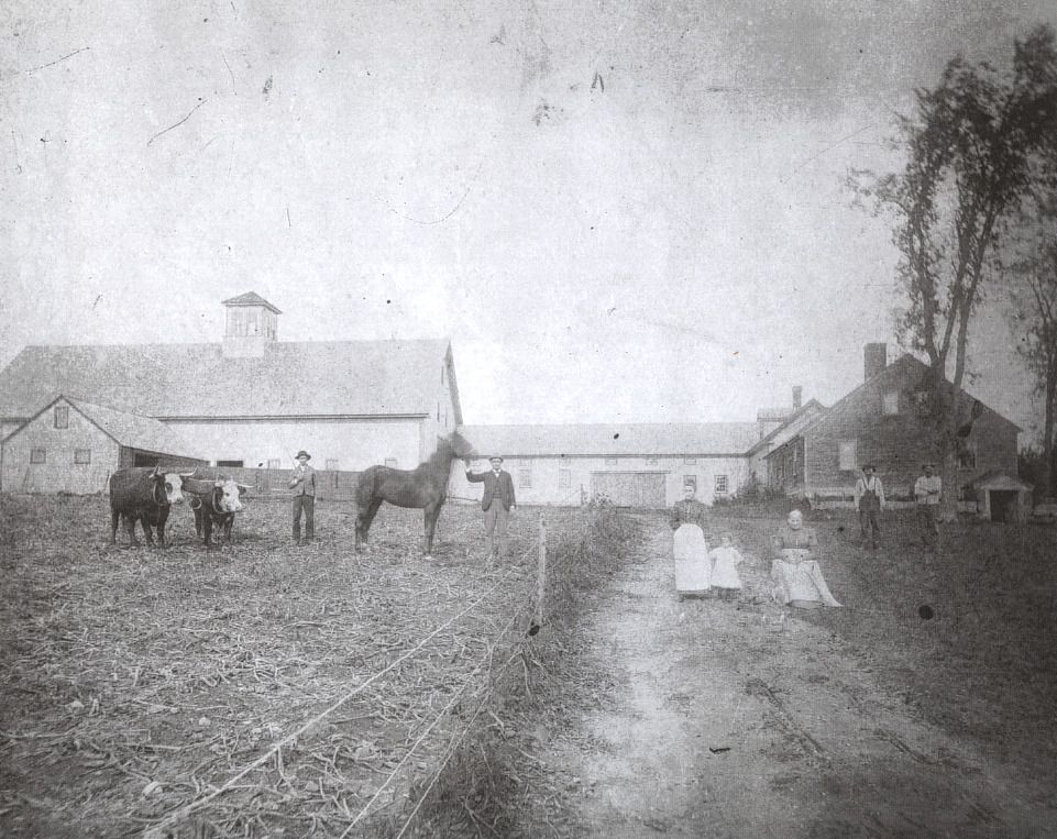 The Alice Haines house off Haines Hill Rd., c. 1895, was built c. 1772 by Joshua Haines. It burned down in 1907 after being struck by lighting. L-R, Joseph Rodney Haines (1830-1898), George Albert Haines (1858-1904, Alice May (Perry) Haines (1873-1947), Louis Margaret Haines (1886-1971), Margaret Lord Haines (1821-1903), & two farm hands.