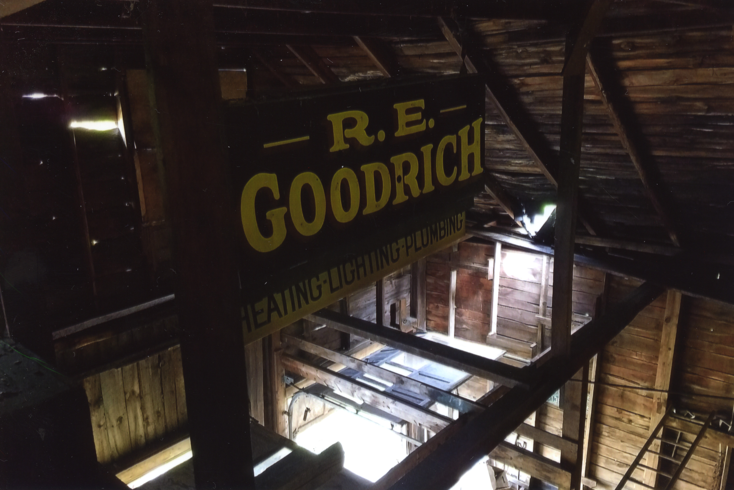 This is the interior of the original Clark House barn, moved to Goodrich Rd. shortly after 1917. Photo is 2019. The barn was used as an electrical shop by Ransom E. Goodrich beginning in the 1920's. The road is named after him. Later, Bud Titus ran an electrical, heating and plumbing shop there under the R. E. Goodrich name. The barn was demolished in 2022.