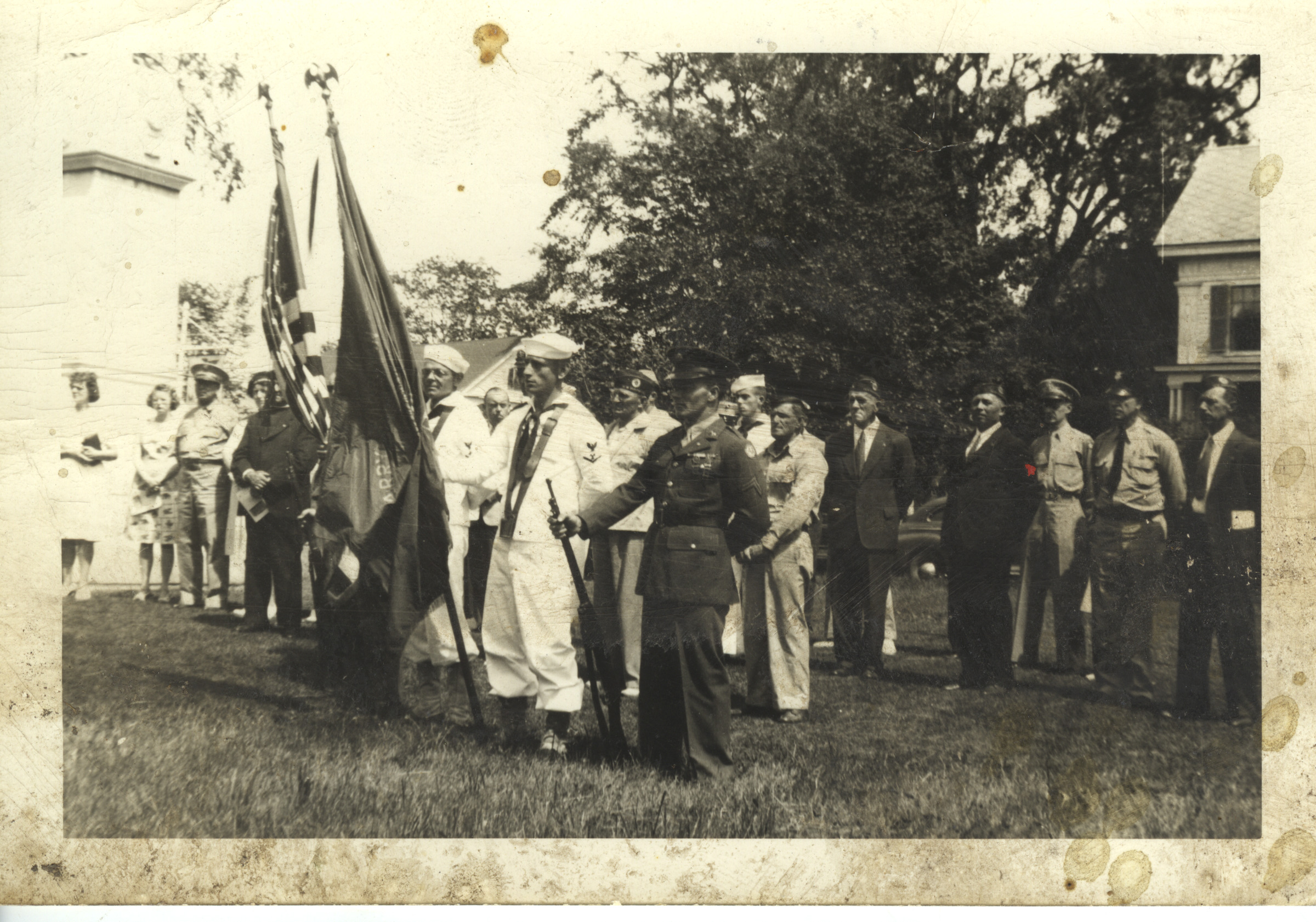 Unspecified occasion. Holding American Flag, H. Parker Jewett. Legion Colors, Henry Valley. Between them, Robert J. Alrich. Behind Valley, Hugo Johnson. Left of Johnson, Tommy Charles. Behind Charles, Earl F. Willand. Left of Willand, Luigi Paolucci. Far right, Marcus Raymond.
