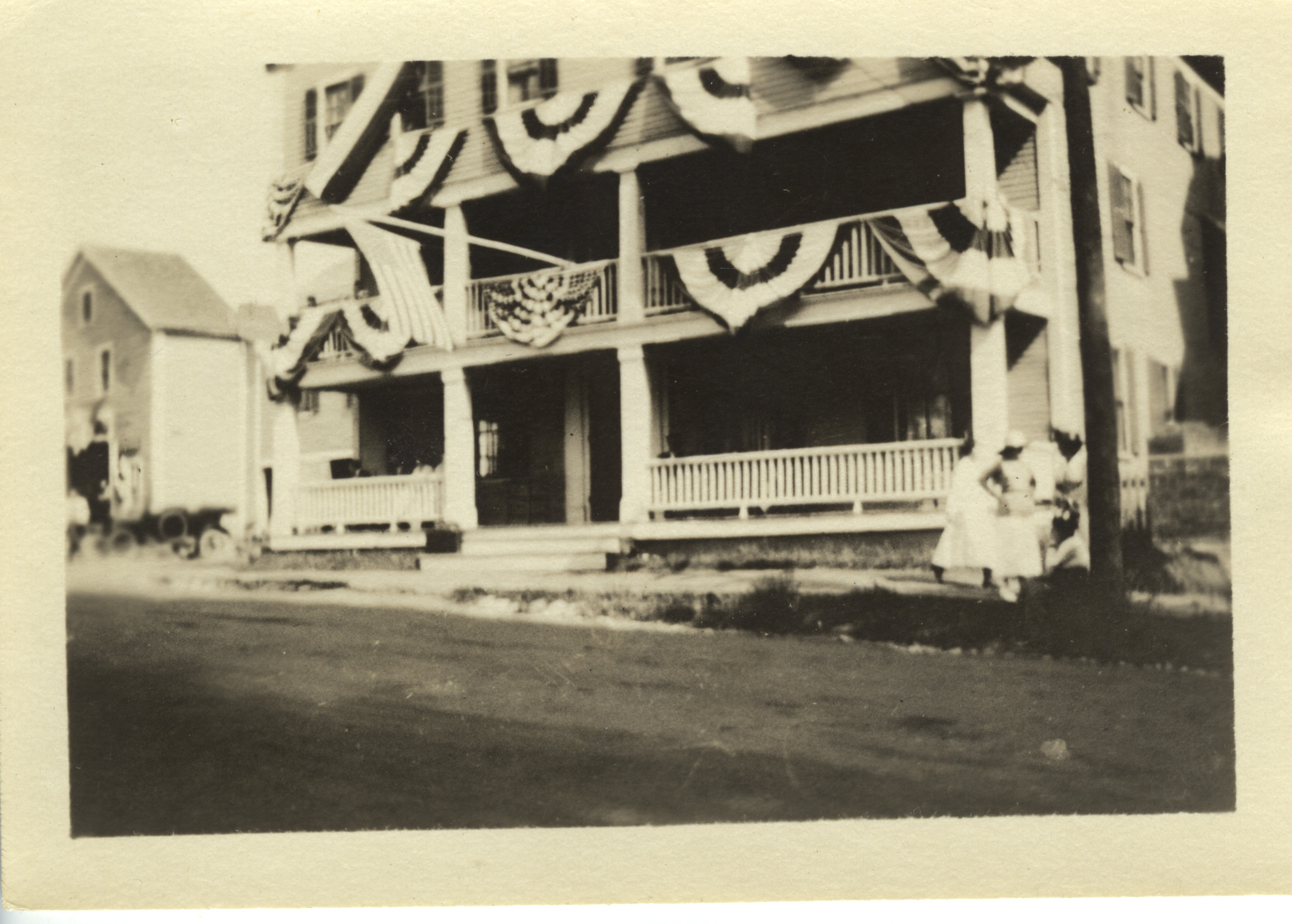 Unknown parade, Sheridan House (now the Wolfeboro Marketplace) is decorated and ready.