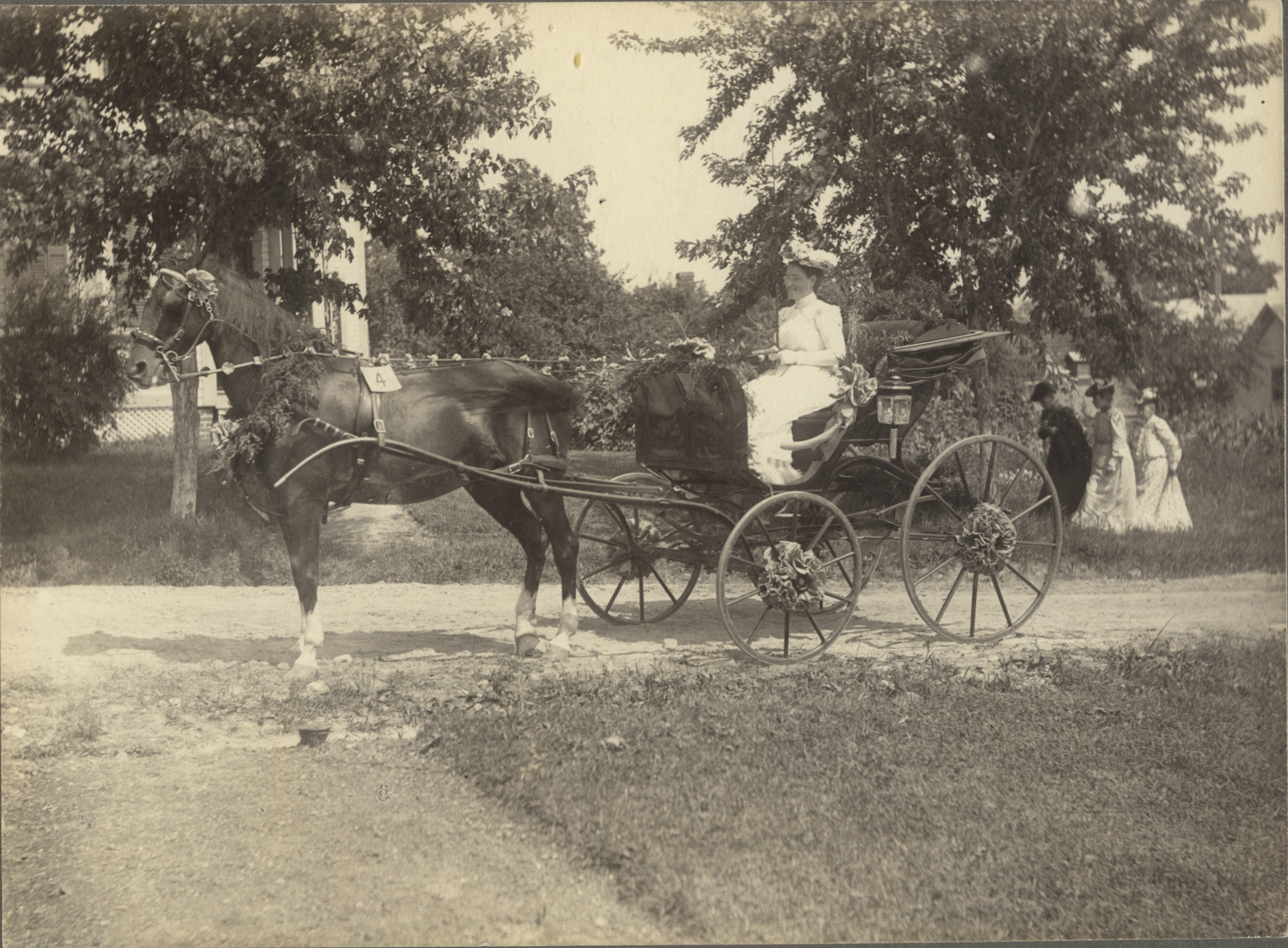 Awaiting their turn to enter the parade, the chaise, horse and woman are all decked out. Driver Sarah Meader actually looks happy, somewhat rare on old photos. There are bells on the reins and flowers on the wheels and wagon. This is an elegant Sunday wagon, with kerosene lanterns on the sides, and a surrey top that flips up for sun or rain protection.