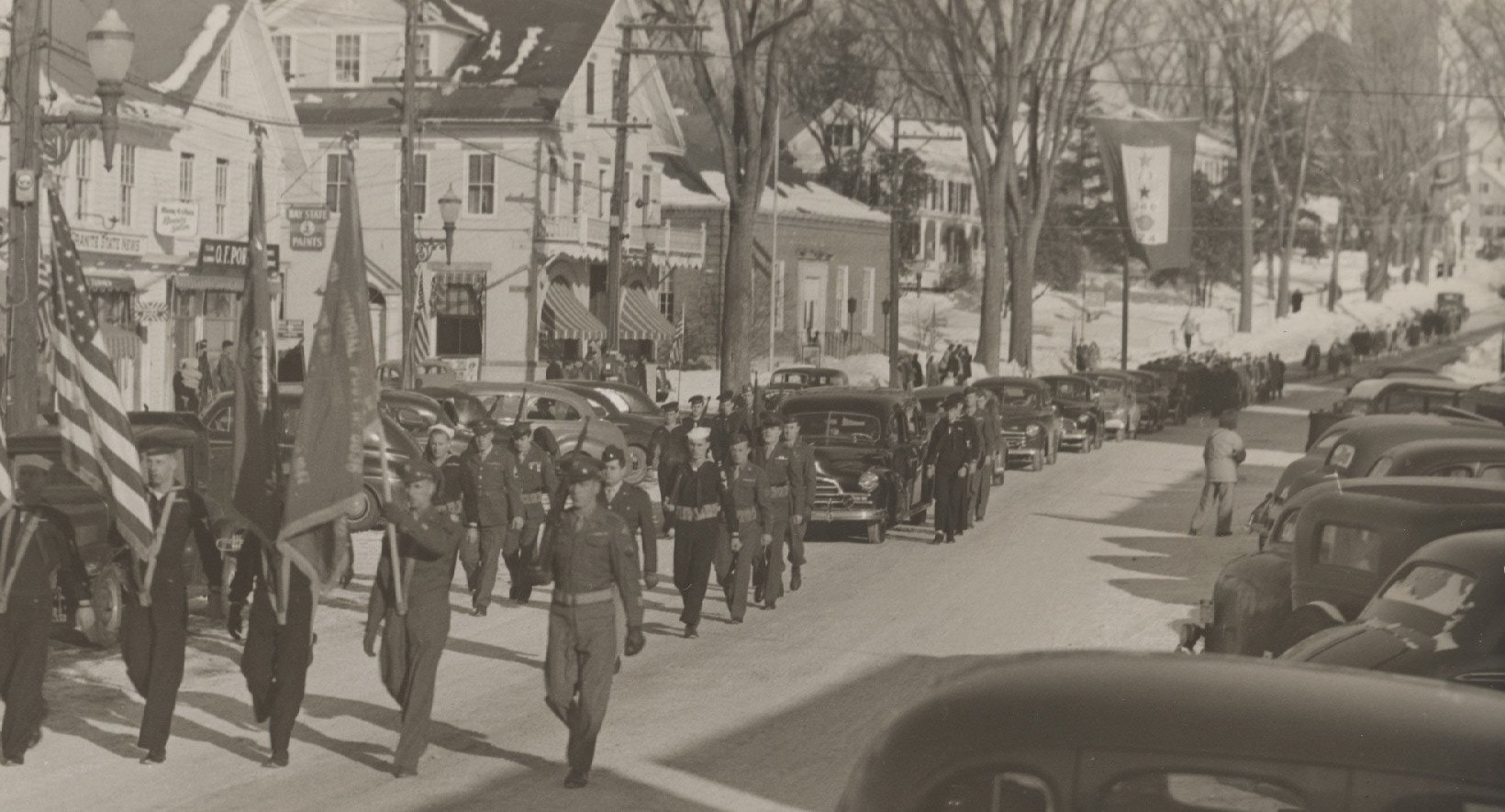 A Military Parade in 1948 is proceeding over several blocks of South Main St. The Town Hall is in the upper right background, and the Post Office and Bank Building are in the middle of the compressed view. The building on the left is today's Black's Paper Store. Note that all Military Branches are represented.