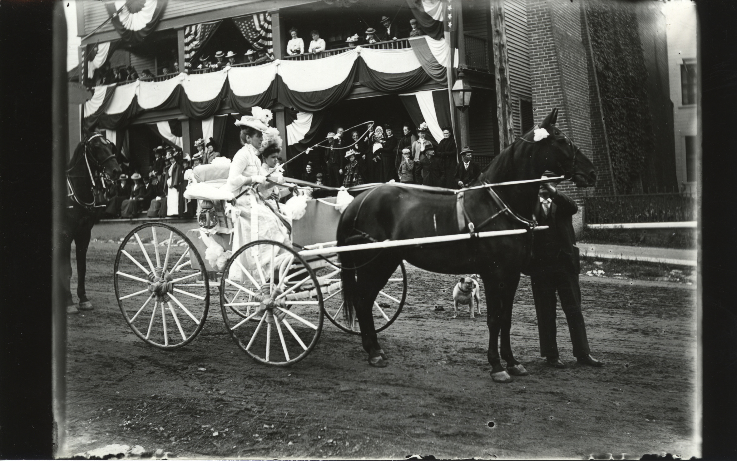 Old Home Day, c. 1900. Ladies buggy in front of Sheridan House (now site of Wolfeboro Marketplace). Driver is Mrs. Herbert E. Haines, wife of a prominent grocer with a long-lasting business in a store located in the Town Hall. Spite wall at right separates the Durgin Building.