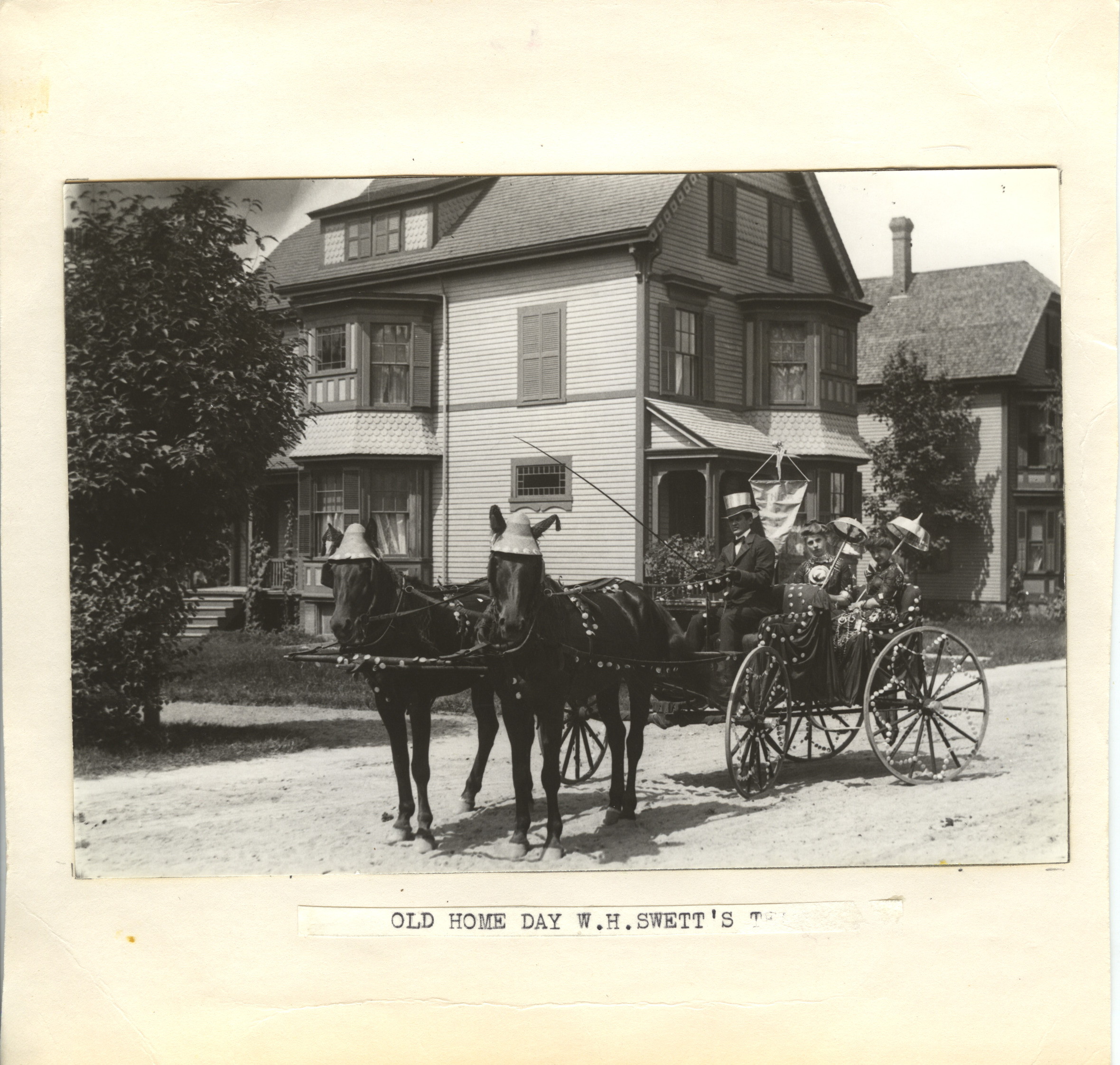 Old Home Day, c. 1900. Horse team and buggy in front of W. H. Swett's Hardware Store in the Folsom Block, now Black's Paper Store.
