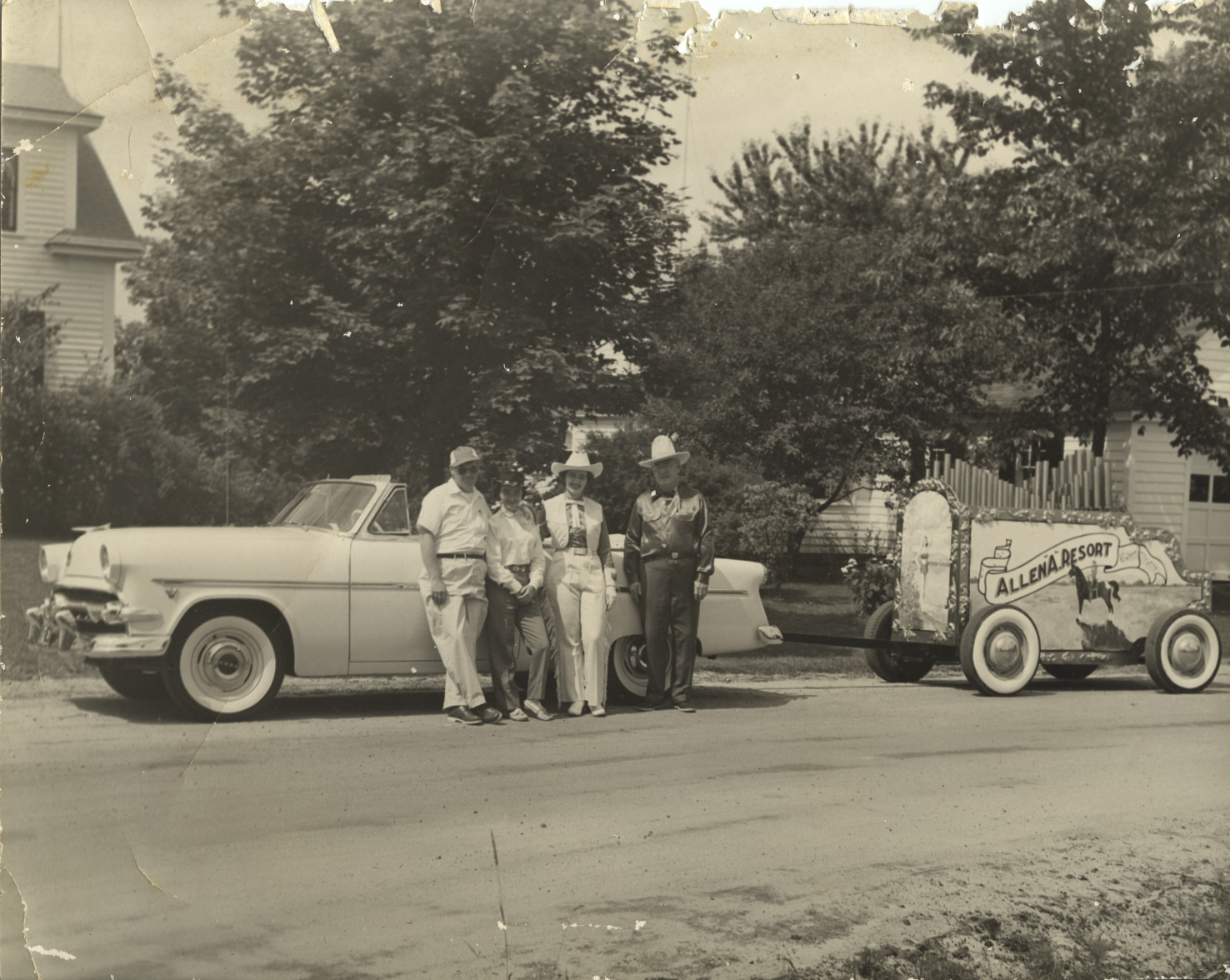 Fourth of July, 1954. The car is towing the calliope of the Allen "A" Resort, a large complex on Route 28. Mr. and Mrs Bean are in the cowboy hats. They probably ran the resort's Dude Ranch operation. They lived in the former Catholic Church building on Sewall Road.