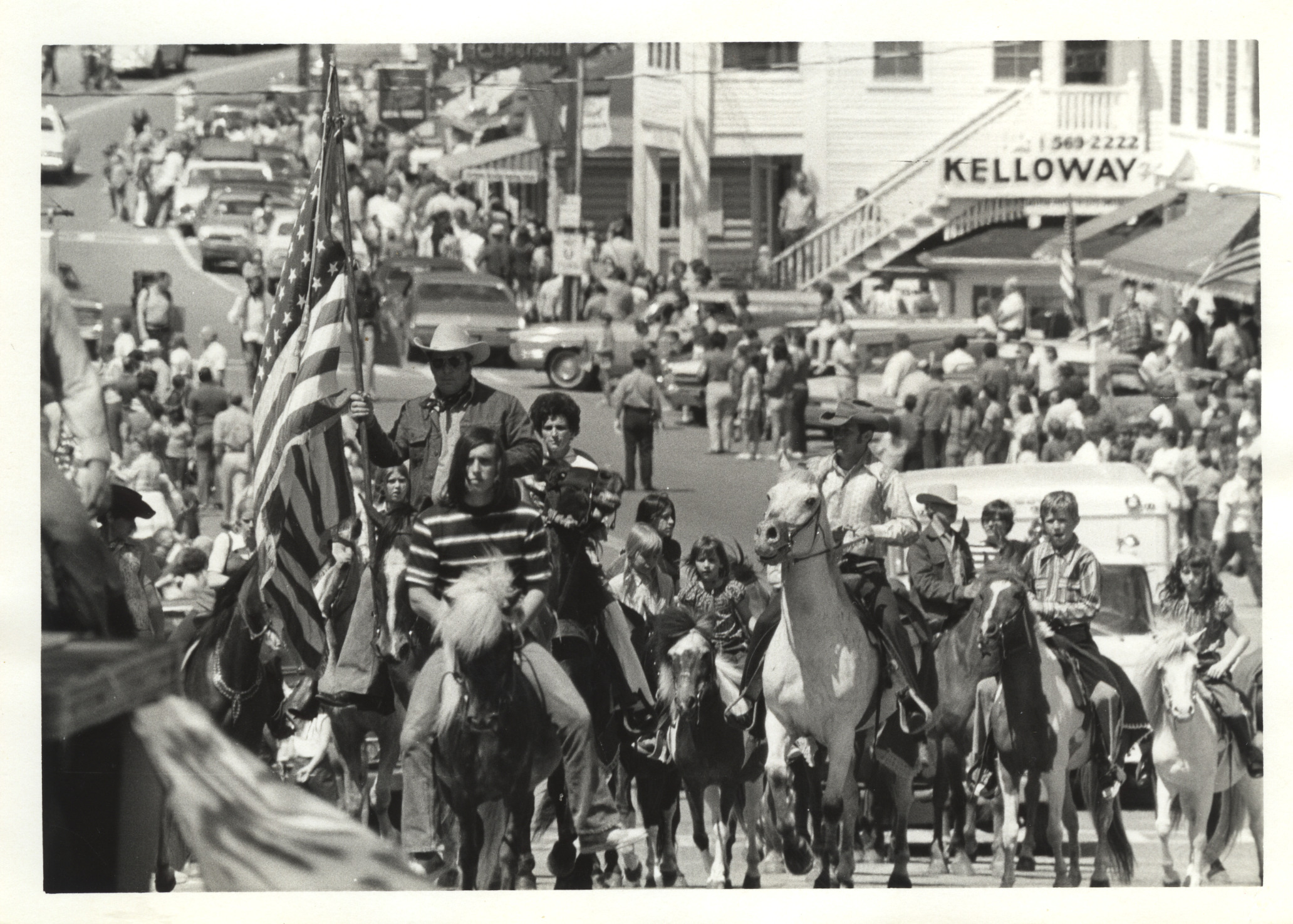 Fourth of July, c. 1980. Parade heading thru downtown, coming from North Main St.