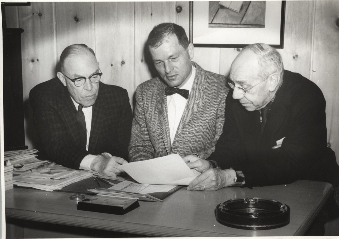 L-R, Wendell Berry, Edwin Goodall, Rev. Frank M. Swaffield (Congregational Church). They are discussing Rotary Club business in the 1960's. They were all Rotary Presidents.